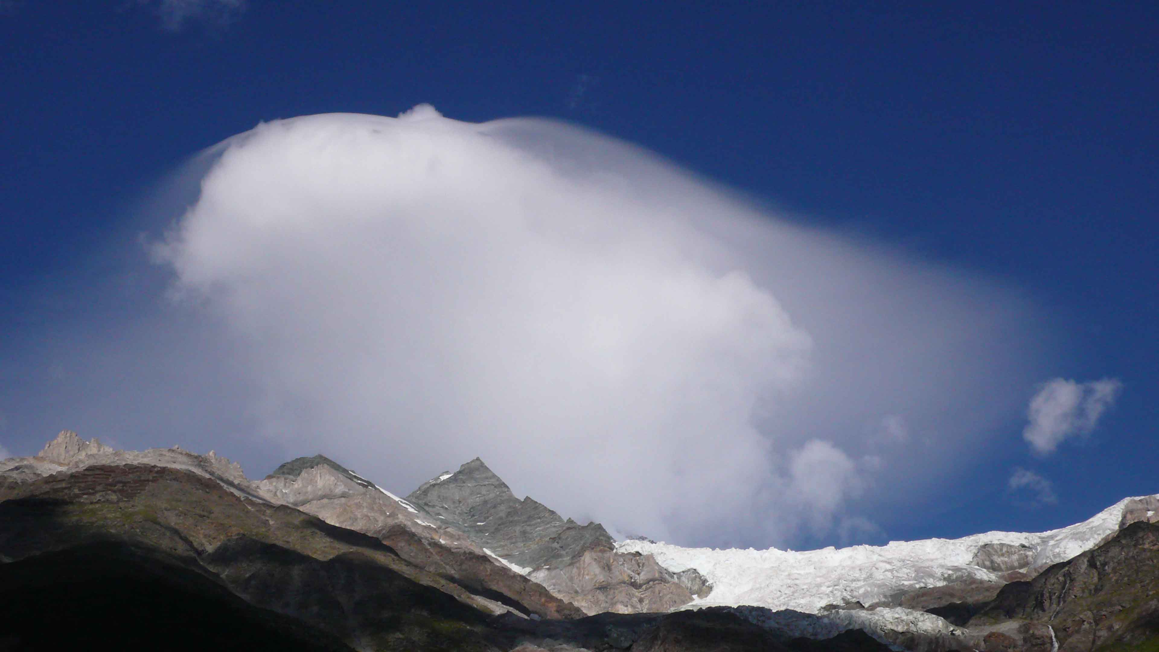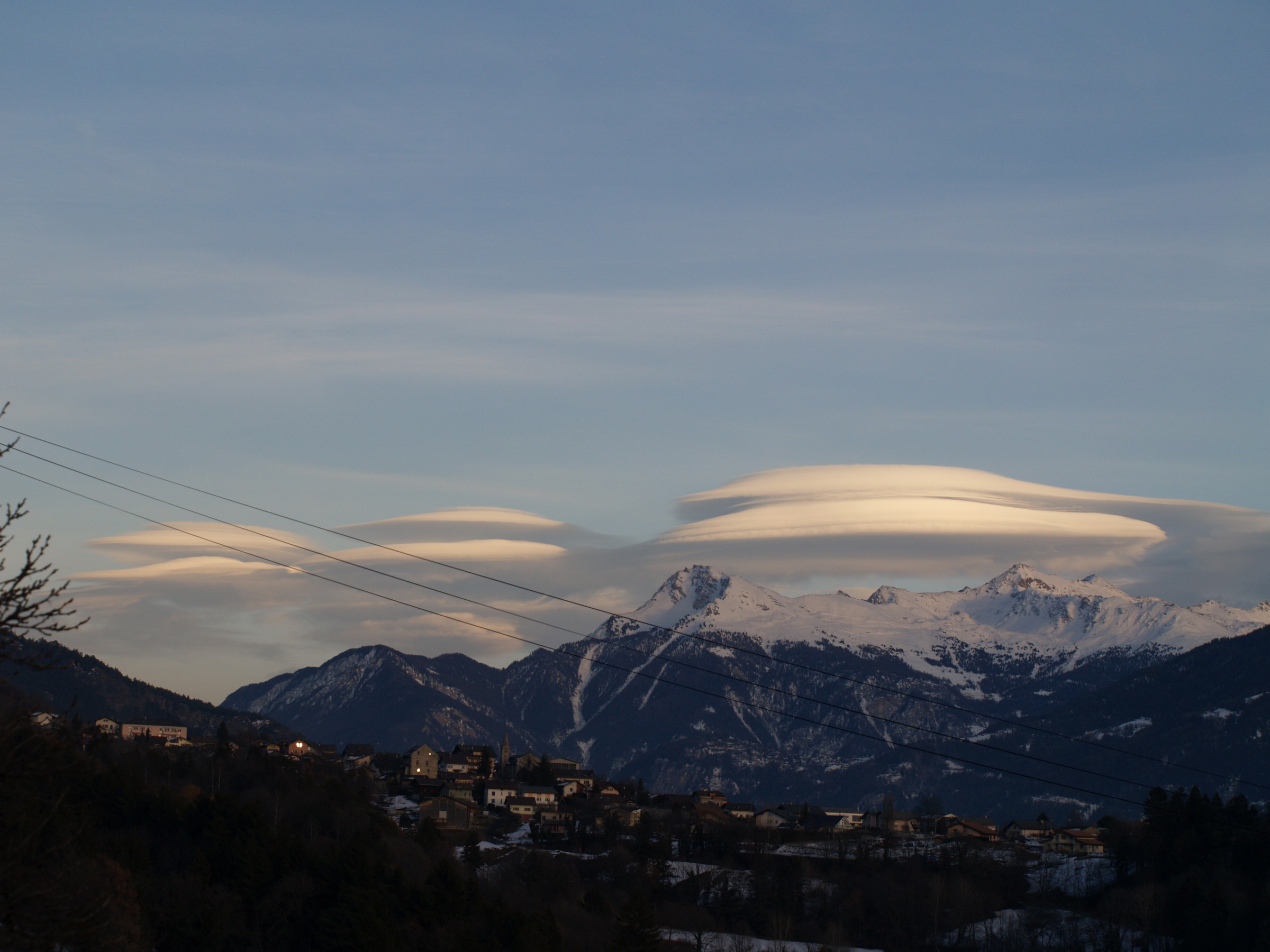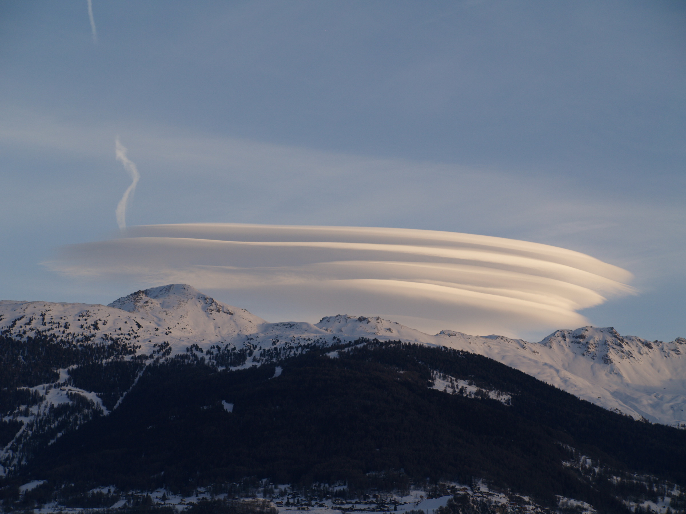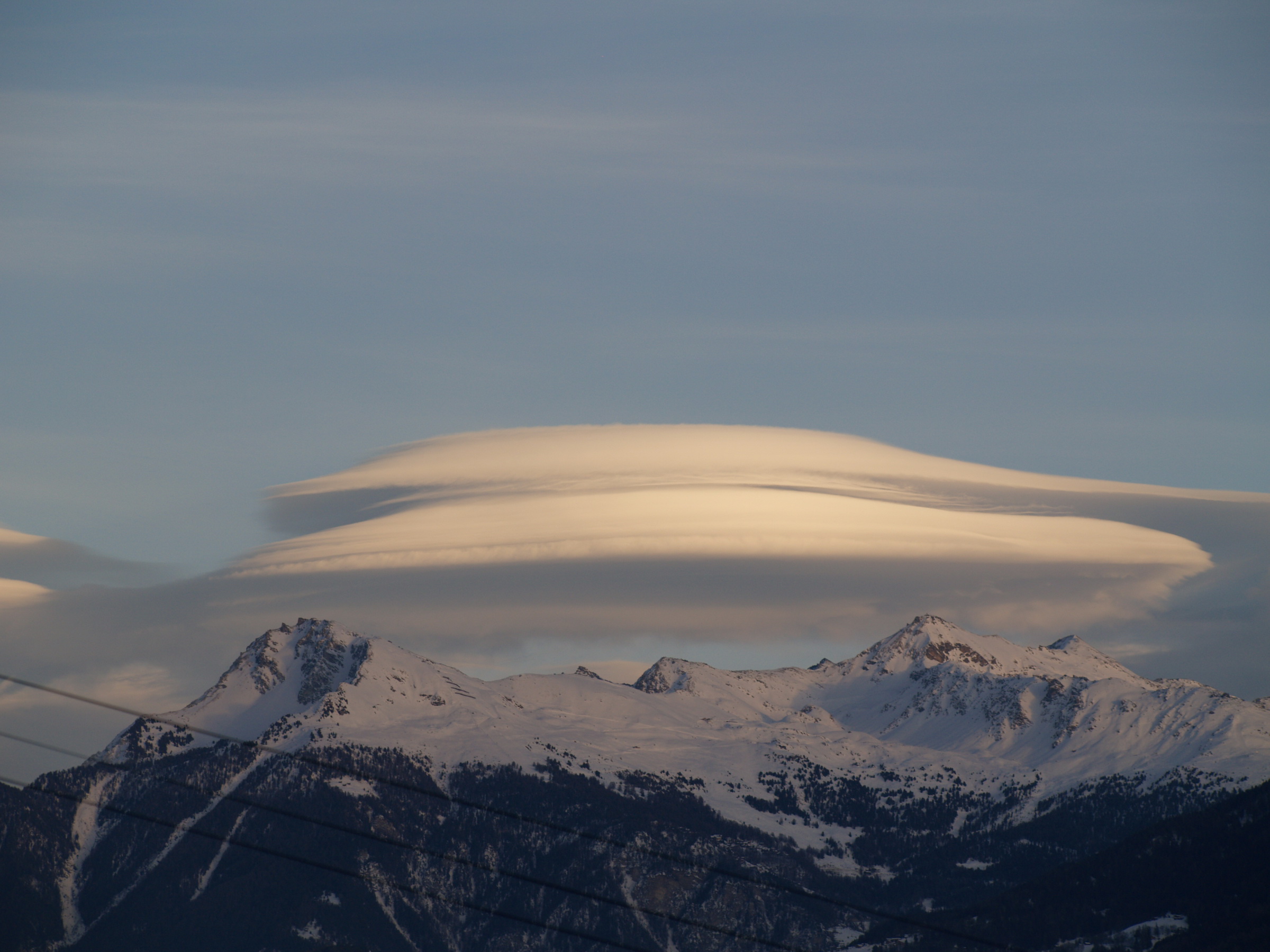 Am 27.7. hats im Mattertal auch schöne Lentis/Strömungswolken bei Westwind gegeben. Anbei zwei Beispiele von hohen Bergen; bei ersten Bild sind sie am Weisshorn (ca. 4500m ü.M.), beim zweiten Am Nadelgrat (4000-4300m ü.M.)