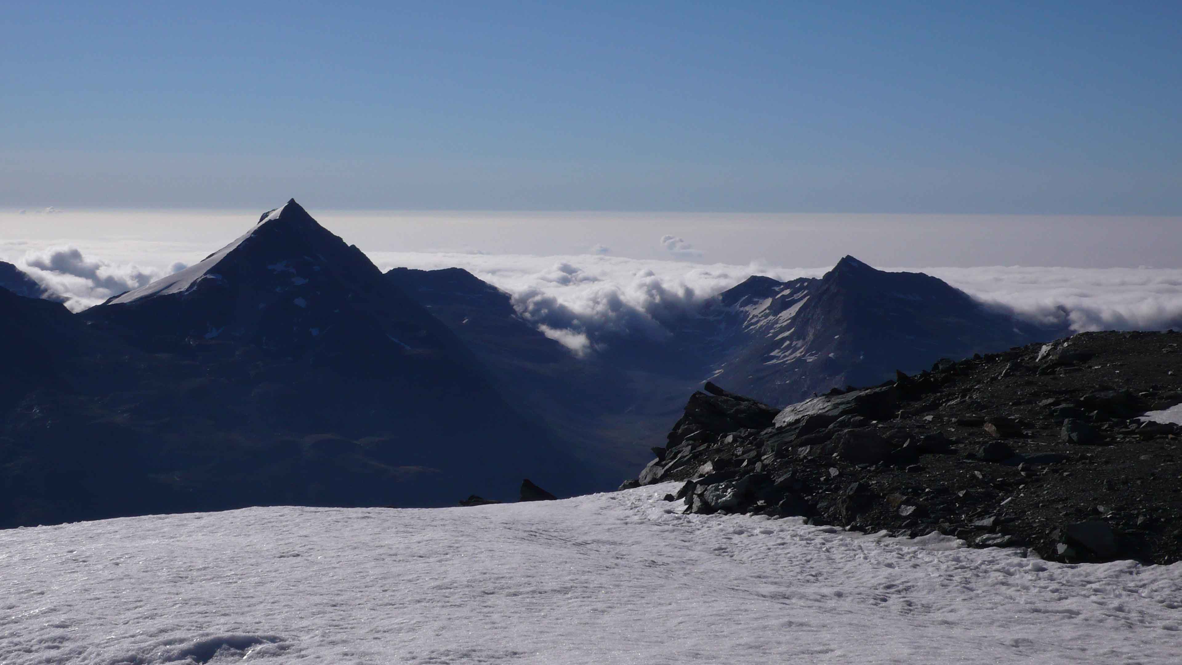 Am Vortag hats übrigens von Süden ziemlich gedrückt. Das Bild zeigt das Stellihorn im Saastal vom Mittelallalin mit Wolken über der Yazzilücke, dem Ofentalpass und gegen den Monte Moro