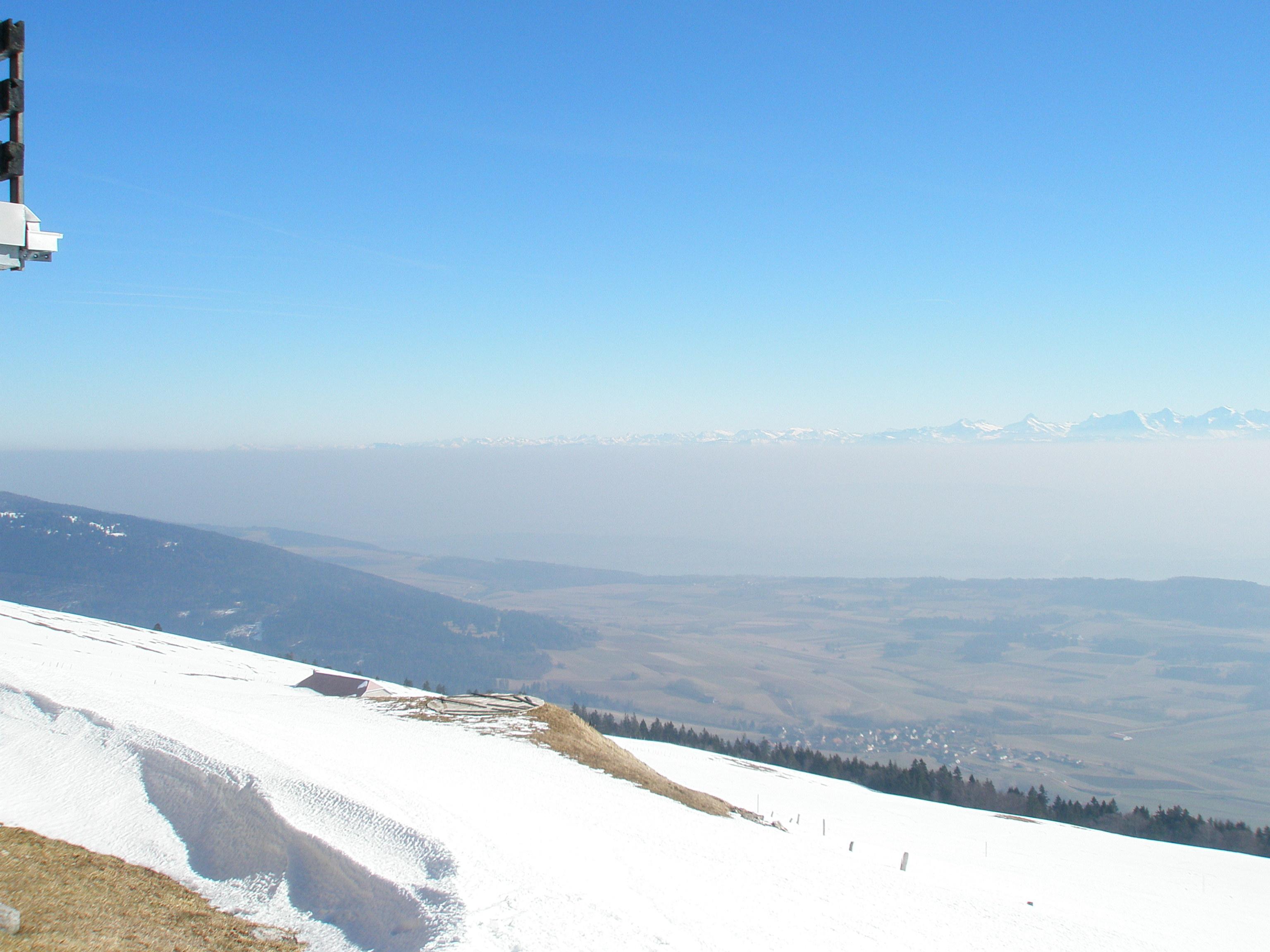 nicht mit Hochnebel dafür mit Dunst bis ca. 1500mü.M. kann ich dienen. Die Aufnahme entstand heute auf dem Chasseral, wo ich auf der Suche nach Restschnee im Jura fündig wurde!