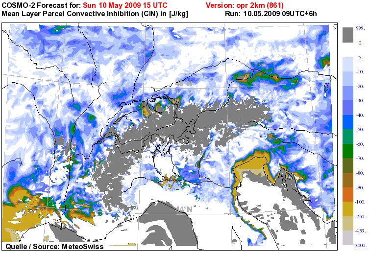 aktuell etwa 1-2°C tiefer als gestern, vor allem in der Deutschschweiz. Hier die CAPE und CIN Felder für heute Nachmittag.