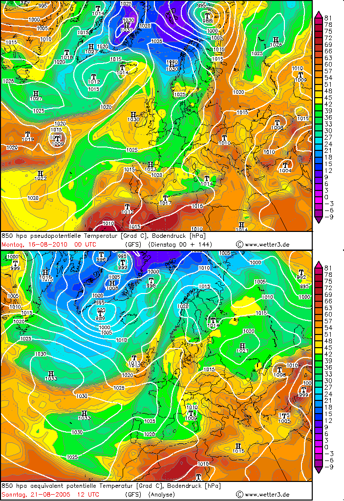 Oben die Analysen vom 2005, unten die EZMWF-Vorhersage von heute Dienstag 00z: