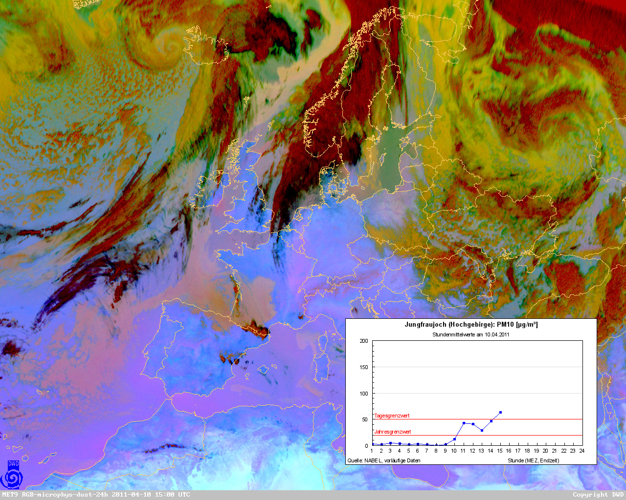 Vielen Dank für dein geniales Bild! Wunderschön sieht man die Luftschichten mit dem Saharstaub drin. Diesen siehst du auch auf Alfred's Grafik mit der Feinstaubkonzentration.