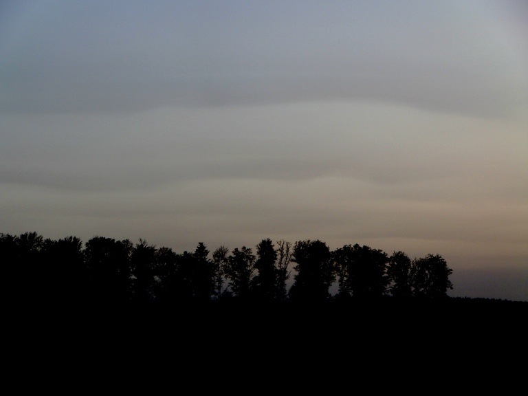 Heute kurz vor Sonnenuntergang gab es diese grauen Schlieren (Bild kontrastverstärkt). Wolken sind anders, ich tippe deshalb auf Aerosole (Wüstensand?).