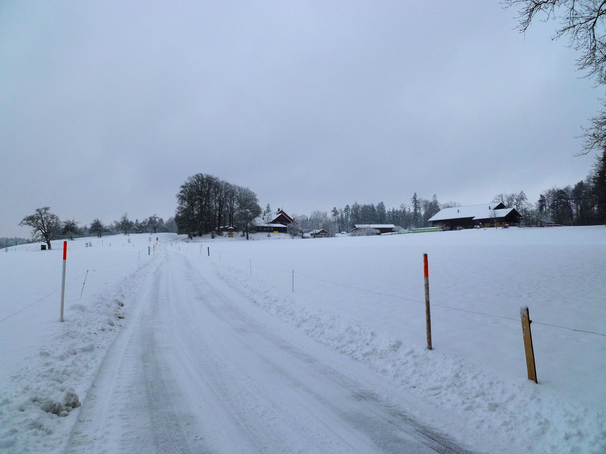 Hier scheint gerade die Sonne durch Wolkenlücken und lässt die Landschaft im herrlichen Wintergewand erstrahlen. So muss man den Winter einfach lieben. (Temp zwar im knappen Plusbereich, war zu erwarten und macht deshalb nix)