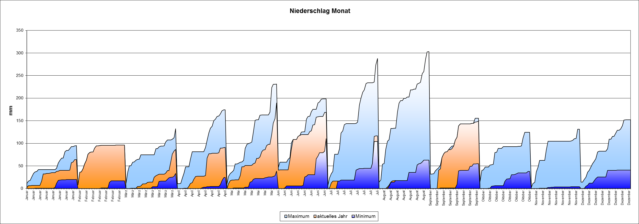Niederschlagsmässig sieht's auch ganz ordentlich aus; nach einem deutlich zu nassen Mai waren Juli uns besonders August viel zu trocken. Seht selbst, auf nachfolgenden zwei Grafiken. Die sind halt erst von den Jahren 2006-2013, daher die Zackigen Extremwerte, doch immerhin lässt sich der Jahresverlauf unter Beachtung, dass der Mittelwert nicht den Normwerten entspricht, damit einigermassen Einordnen.