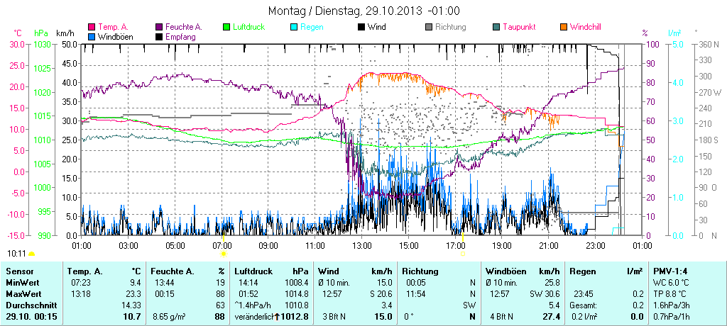 Zwar hielt sich die Geschwindigkeit (Böen Max. 30.6, bzw. 37 km/h) in Grenzen, aber die minimale Luftfeuchte von 19% sehe ich hier doch eher selten. Mit 23.3°c auch wärmer als meine beiden Gürbetaler-Stationen. Dort gab's dafür gleich an beiden Tagen bis 75 km/h Böen Westwind auf 2m. Nichts spezielles, aber immerhin tut sich mal wieder was in der 2013er-Windflaute...