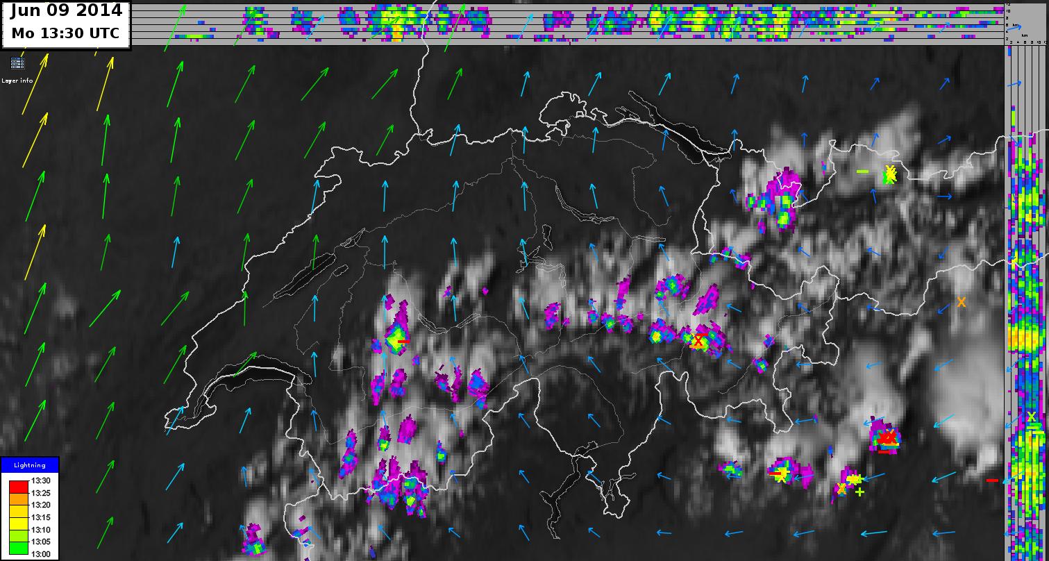 Gewaltig, wie schnell das geht! Wie stark der Aufwind in einzelnen Türmen sein muss erkennt man daran, dass manche Zellen zu blitzen anfangen bevor ein deutliches Radarecho zu sehen ist. Ist aber auch ein Zeichen für kurzlebige Pfupfis, denen rasch wieder der Saft ausgeht.