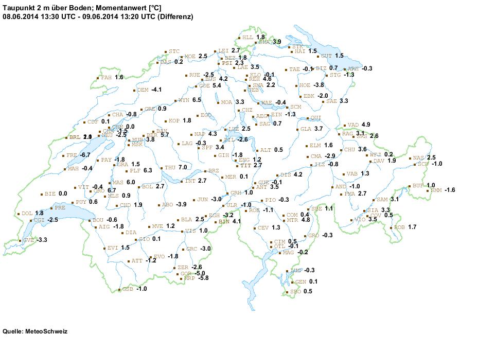 Taupunkte aktuell auf 12-17°C, mit ein paar Ausreissern nach oben sowie unten, Differenz zu gestern eher positiv (feuchter),