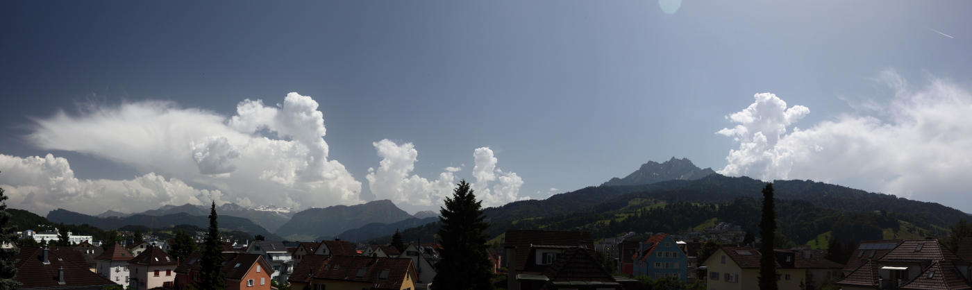 Hier die von Willi erwähnten Cb's aus näherer Distanz. Es kommt langsam Bewegung in die Wetterküche. Allerdings erscheinen mir die Cb's etwas schmächtig, es fehlt wohl doch noch einiges an Feuchte.