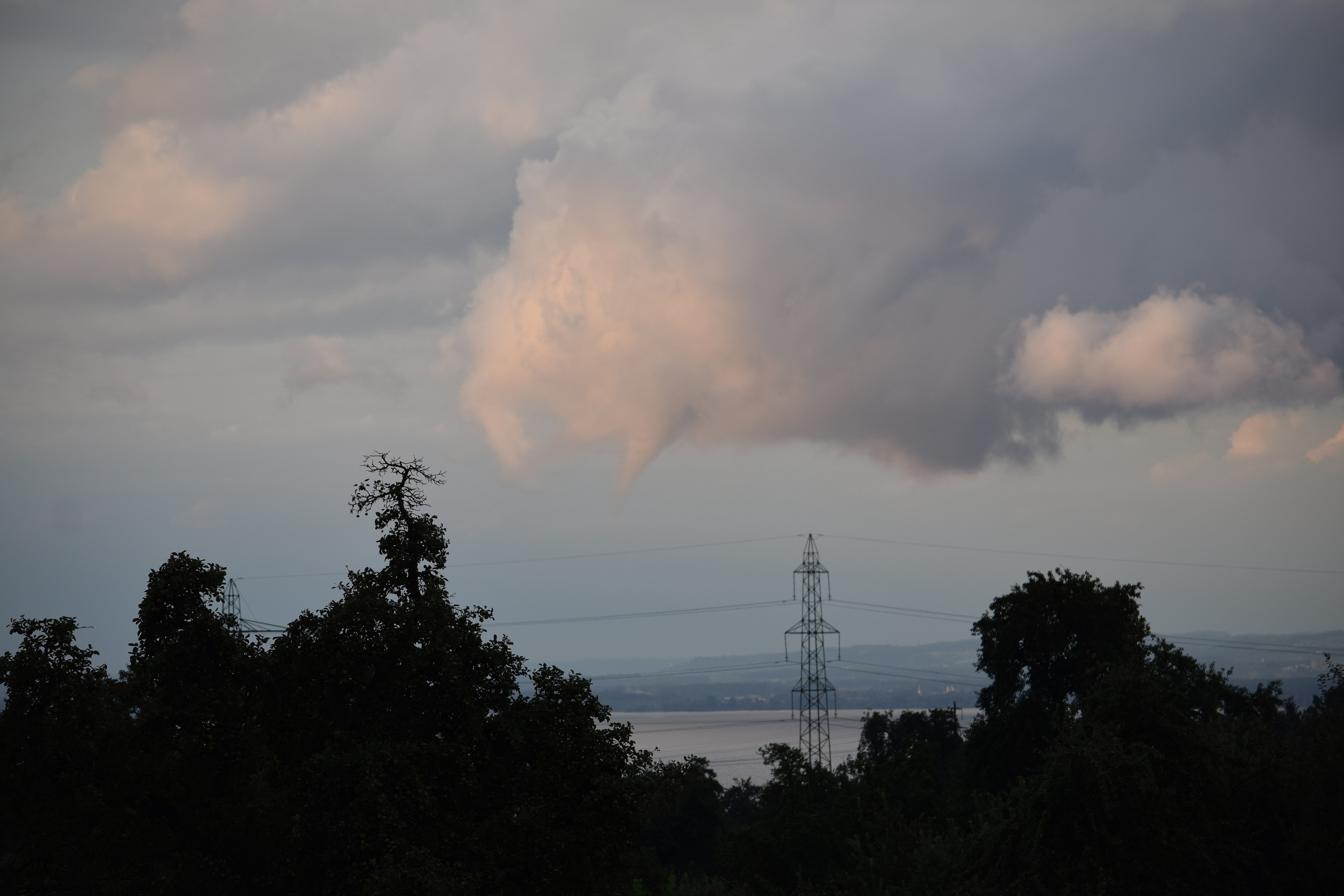 Nachdem sich die erste Zelle um 17 Uhr rasch wieder auflöste, bildete sich ein Gewitter auf der deutschen Bodenseeseite. Ich wusste: Jetzt muss es schnell gehen. Noch in Mörschwil sah ich den ersten Wasserhosenansatz aus Wolken am Rande der Zelle (Puls ging hoch :-D )