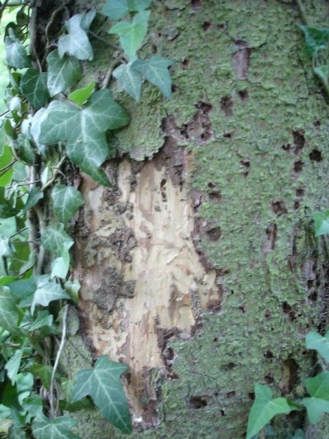 Ich habe vorhin schnell bei uns im Wald eine Fichte fotorafiert die von beiden befallen ist. Es muss aber gesagt sein das sie das vorletzte Jahr befallen wurde, sprich sie ist etwa schon ein Jahr lang Tot. Aber die Schäden sind sichtbar: