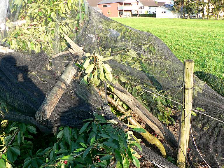 Seine rund 5000 Quadratmeter grosse Kirschenanlage sei sonst sehr stabil, sagt Bauer Ernst Bär. Sie habe schon Windgeschwindigkeiten von über 100 Stundenkilometern unbeschadet überstanden. Viele Kirschen liegen nun am Boden. Den Rest will Bär so rasch wie möglich ernten und nicht wie üblich an der Strasse, sondern über den Grosshandel verkaufen. Glück im Unglück: Die Wetterprognosen sind gut. Würde es stark regnen, könnten die jetzt grösstenteils ungeschützten Kirschen platzen. Ernst Bär: «Hunderte von Arbeitsstunden brauchen wir ohnehin, bis alles wieder aufgebaut ist.» Zusammen mit seiner Familie und den vielen Helfern, die sich bei Bär gemeldet haben, will er den Schaden so rasch wie möglich beheben. lESTHER SIMON