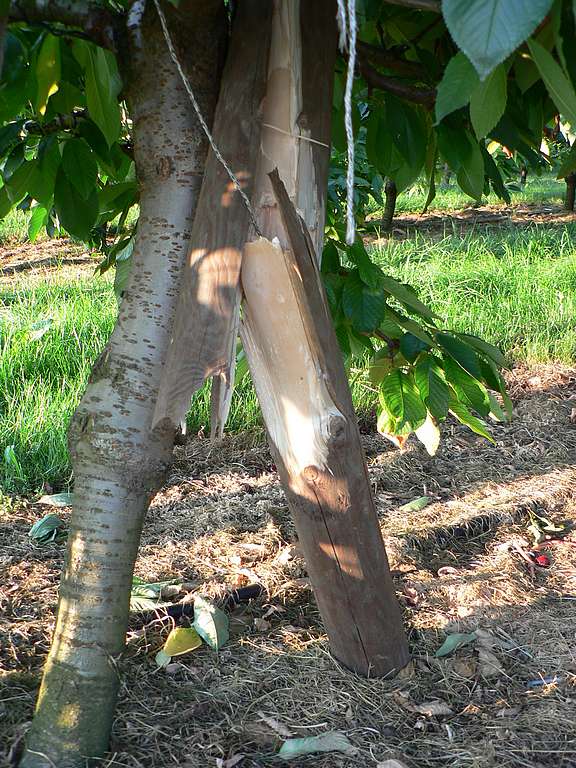 Die Schäden bei der Kirschenplantage in Opfershofen (Schadensplatz Nr. 2) waren beträchtlich. Die Hagelnetze waren zusammen mit einer Plastikabdeckung (ich glaube zum Schutz vor Regen) über Dutzende von Holzpfeilern gespannt und gesichert mit starken Drahtseilen. Die Holzpfeiler sind vor allem in einem Bereich der Anlage geknickt (zum Teil mehrfach) oder aus dem Boden gehoben worden. Die Netze und Blachen sind an dieser Stelle richtiggehend weggelitzt resp. aufgerollt worden. Es ist schwierig zu beschreiben, aber ich kann sagen, dass die Kräfte enorm gewesen sein müssen. Klar können auch Gewitterböen enorme Kräfte entwickeln (vor allem wenn sie unter eine Abdeckung oder ein Dach greifen können). Die Augenzeugenberichte und die vorgefundenen Schäden (punktuell enorm, ansatzweise in einer Schneise, rundherum nicht den Hauch eines Windschadens), sowie die Vermutung, dass sie im Aufwindbereich des Gewitters entstanden sein könnten (siehe Augenzeugenbericht weiter oben), lassen in mir den Verdacht auf einen Tornado erhärten. Dennoch: Das Schadensmuster ist nicht eindeutig (z.B. nicht eindeutig konvergent) und eine Schneise ist auch nur ansatzweise erkennbar. Ein Foto oder Video konnte ich nicht auftreiben. Herr Meyer aus Opfershofen (im Artikel der Thurgauer Zeitung erwähnt) hat leider erst zu spät zur Kamera gegriffen und nur noch festhalten können, wie die eine Vogelfolie Richtung Leimbach fortgetragen wurde (als der Spuk eigentlich schon fast wieder vorbei war).