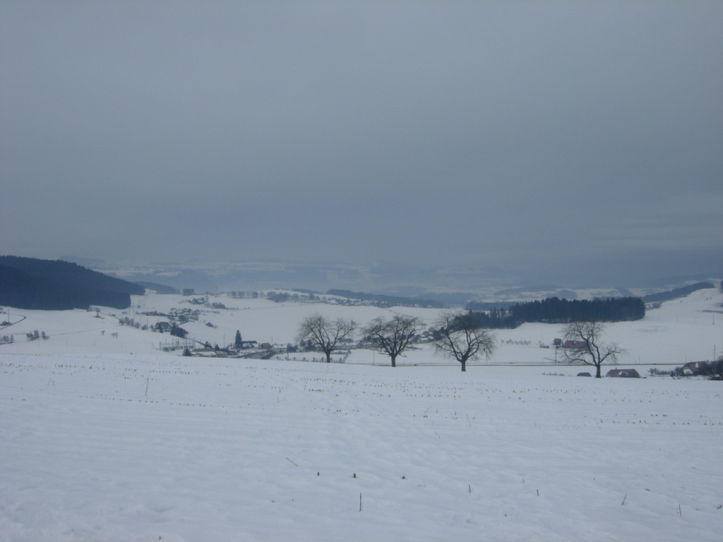 Hier merken wir derzeit nichts, dass es 100km nordwestlich schneit bzw. eisregnet. Es hat Nebel, die Sonne drückt leicht durch und es ist kalt, aktuell - 1.2°C.