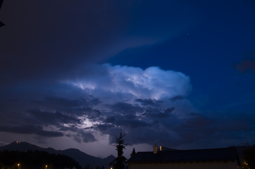 Momentan ein bisher mässiges Gewitter - gerade jetzt als ich schriebe ist es plötzlich heftiger geworden mit starken Böen.
