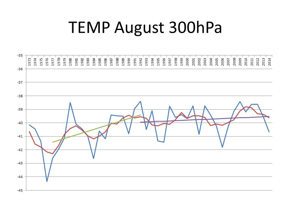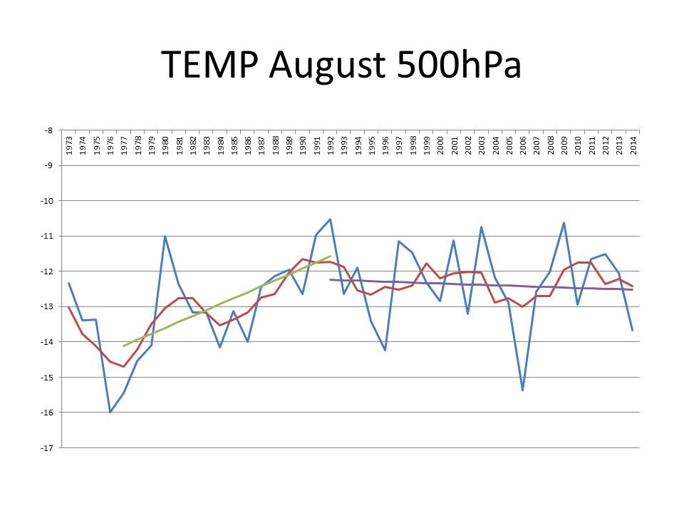 Wenn man sich nun die Karten für Anfang August anschaut (und übrigens auch für die letzte Woche), dann fällt auf, dass der Trog mit seinem Kern deutlich weiter östlich, also näher an den Britischen Inseln liegt. Zudem schwenkt der Trog weniger weit nach Süden aus:
