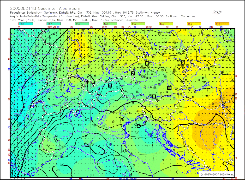 Zusätzlich wird noch warmfeuchte Luft herangeführt(höhere Theta E Werte),Taupunkte am Bodensee um 16°,in der Westschweiz zwischen 13° und 14°.