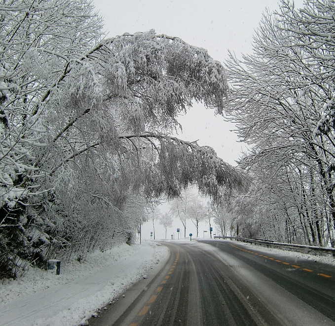 Schön verschneite Bäume findet man um 600 Meter, Hochwinter darüber. Strassen teils chaotisch; Autos stehen quer.