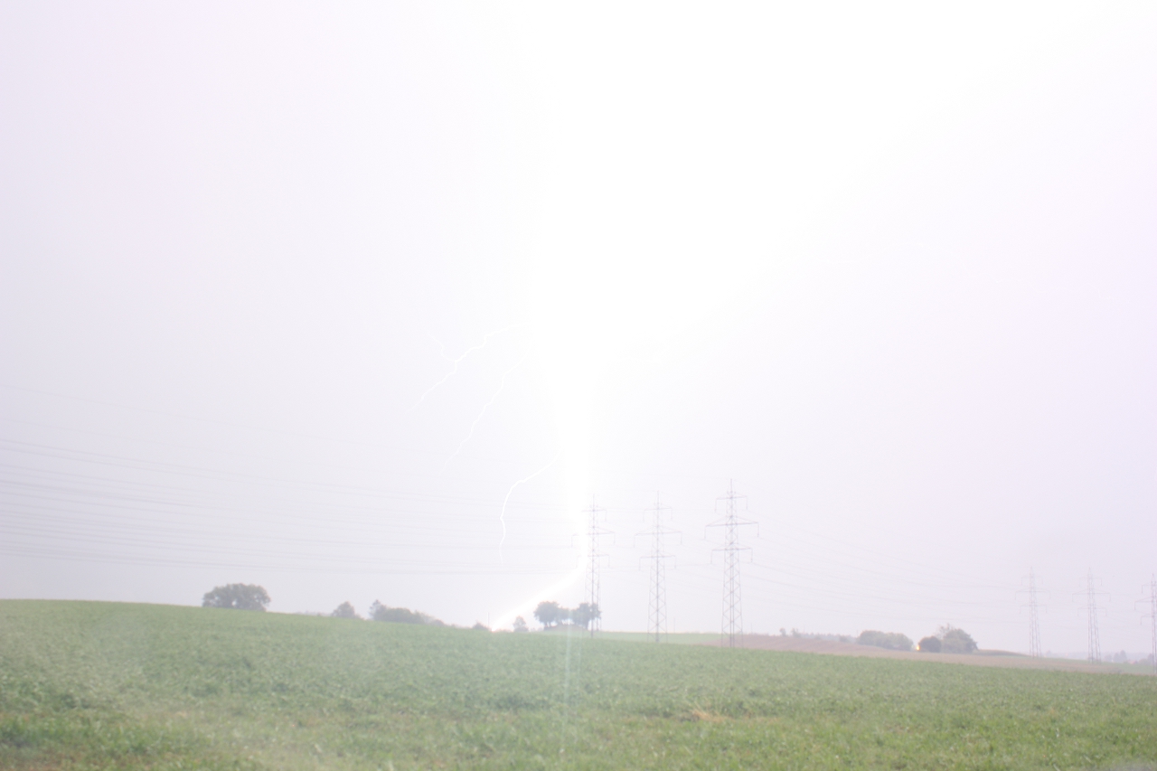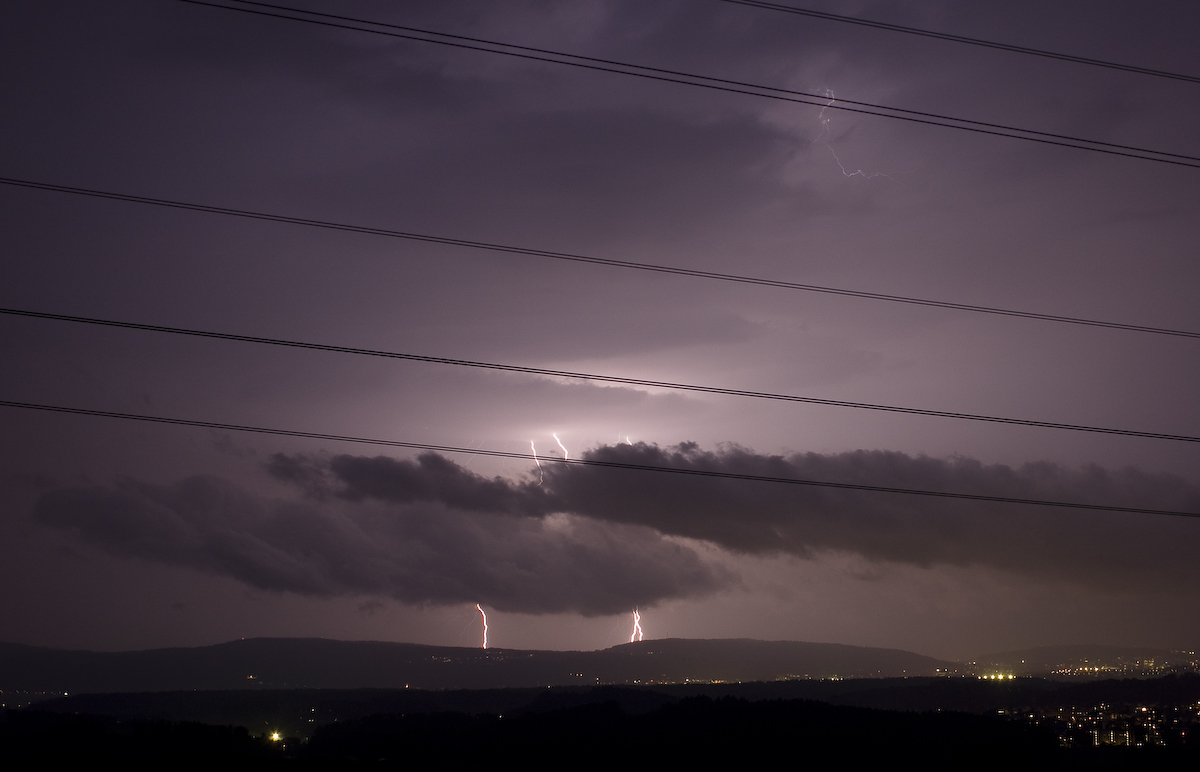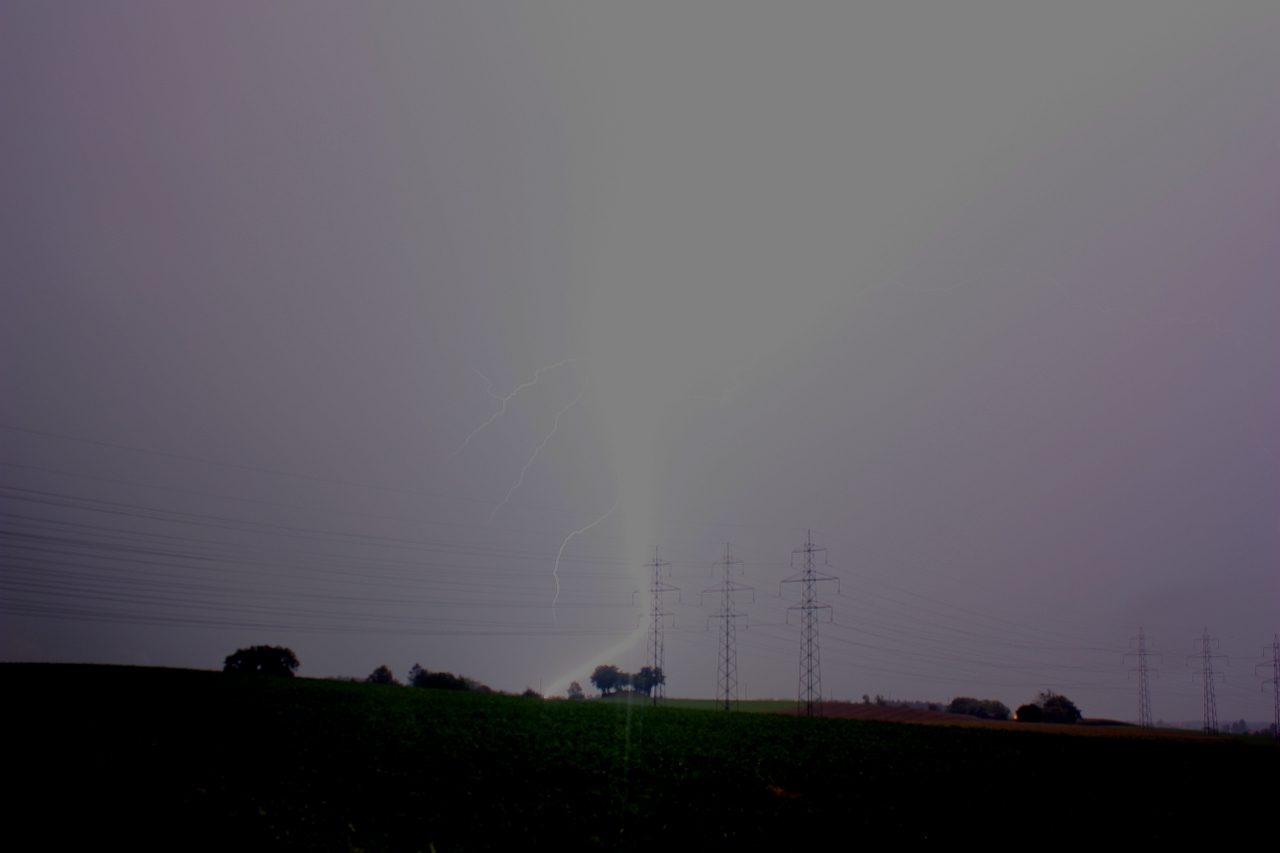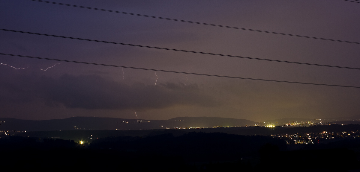 Von wegen Hochspannungsleitungen, ich war am 24.8. in der Nähe von Brütten, um mir das Gewitter anzusehen. Dabei habe ich viele gute Fotos gemacht, vor allem während der Dämmerung :unschuldig: . Etwas später aber gabs am laufenden Band Einschläge in nächster Entfernung (>500m), siehe erstes (unbearbeitetes) Bild. Dabei waren einige mächtige Kracher direkt in den nächstgelegenen Mast, vielleicht 100m entfernt :shock: :warm: , die ich nur mit extremem Bearbeiten sichtbar machen konnte. War echt eindrücklich, das ganze aus dem Auto zu erleben. Einstellungen an der Cam waren die selben.