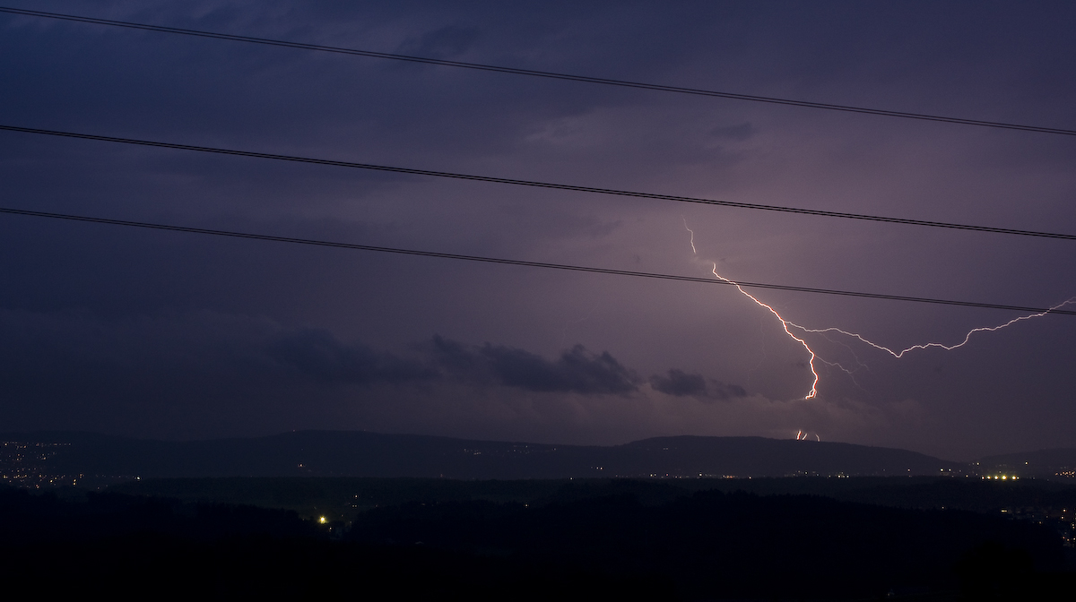Die Blitze kamen nun immer näher und da ich (wie auf den Bildern unschwer zu erkennen) unmittelbar vor einer Hochspannungsleitung positioniert war, wurde es mir ziemlich mulmig zu mute. Vor allem krochen nun die im Thread mehrmals beschriebenen Ustemer-Houseshaker langsam den Hang hinauf (linker Bildrand) und ich verlor immer mehr den Mut und spurtete schlussendlich in das ein paar hundert Meter entfernt parkierte Auto zurück.