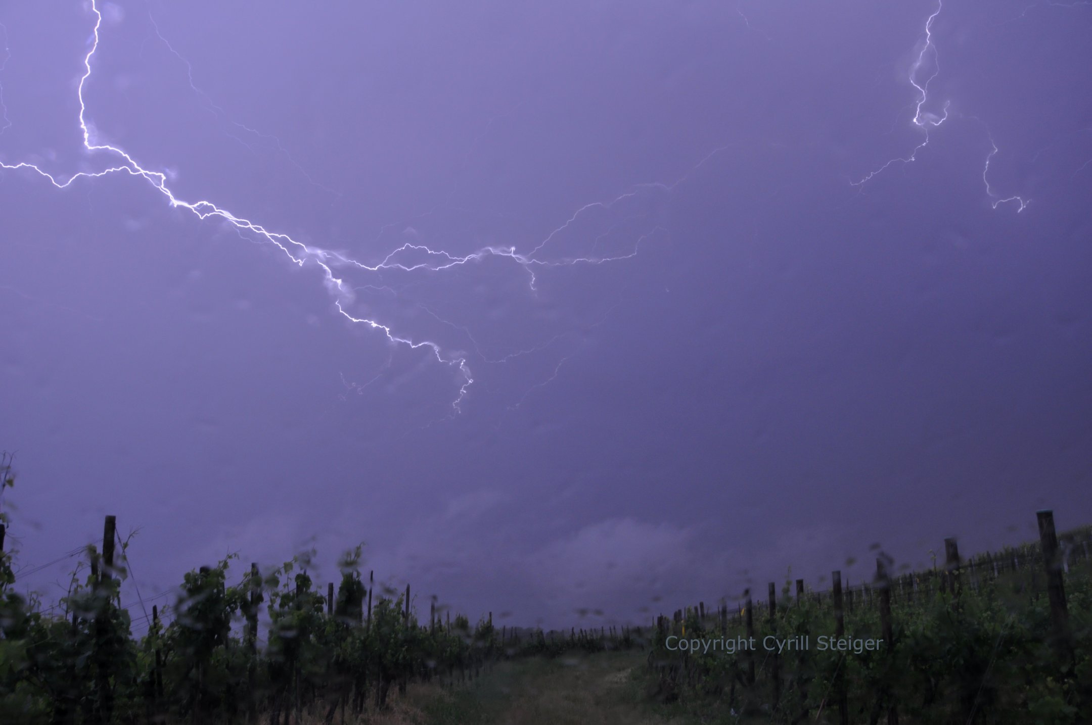 Ich fuhr in Richtung N20-Nordumfahrung und blieb im Stau stecken (wie erwähnt). Über Zürich (auch Verkehrskollaps...!) gelangte ich nach Winterthur, wo es soeben zu regnen begonnen hatte. Ohne anzuhalten fuhr ich der vermuteten Zugbahn voraus, ans Trockene und positionierte mich neu in den noch relativ niedrigen Weinreben bei Benken, von wo man einen tollen Weitblick hat. Das nützt aber nichts, wenn die Blitze im Niederschlag eingebettet sind:....