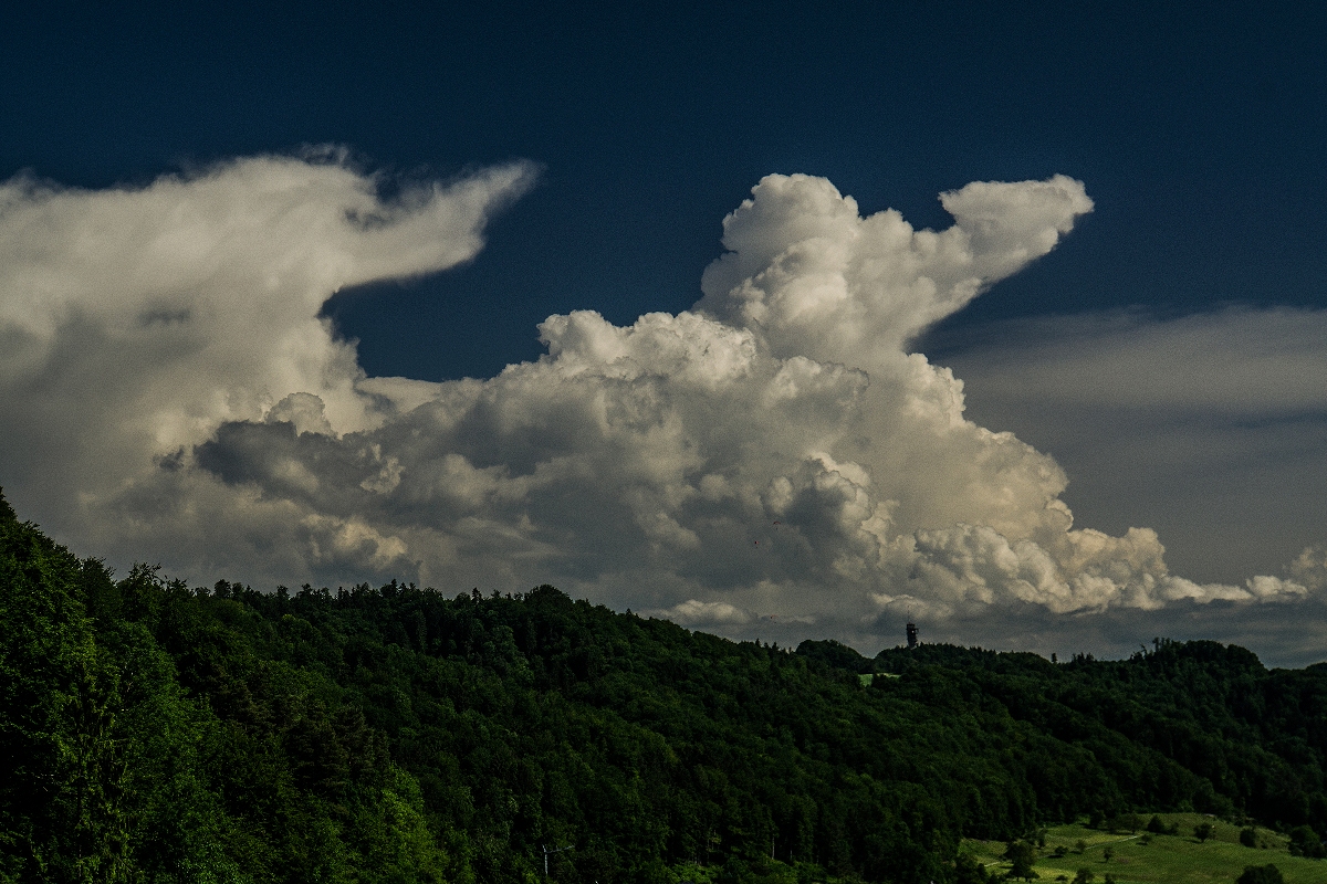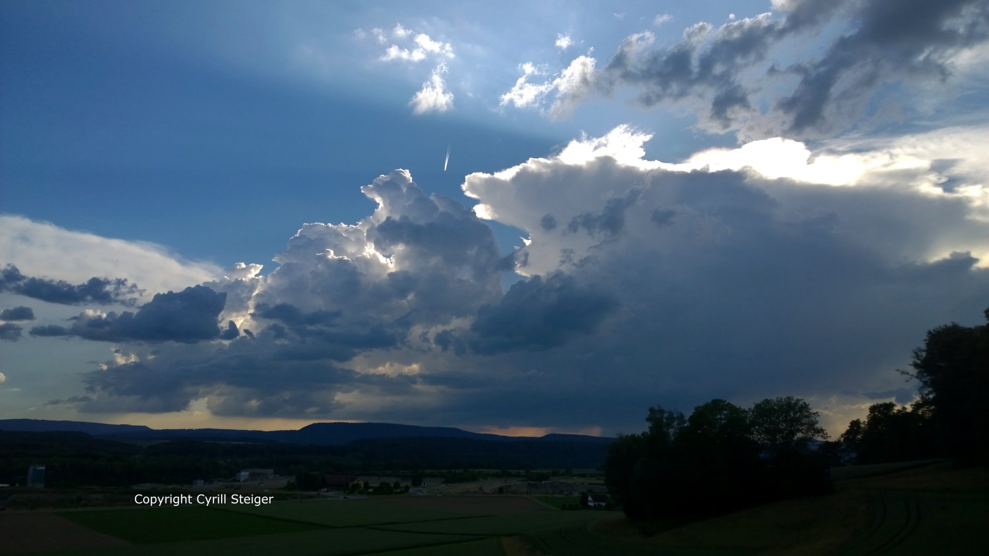 Am Abend so zwischen 7 und 8 stieg die Spannung. Im Forum wurde auf die markante Konvergenz etwa über dem Kanton Aargau hingewiesen. Also Blick gegen Westen. Eine Reihe von Cumuli versuchten ihr Glück, zunächst ohne zu reüssieren.