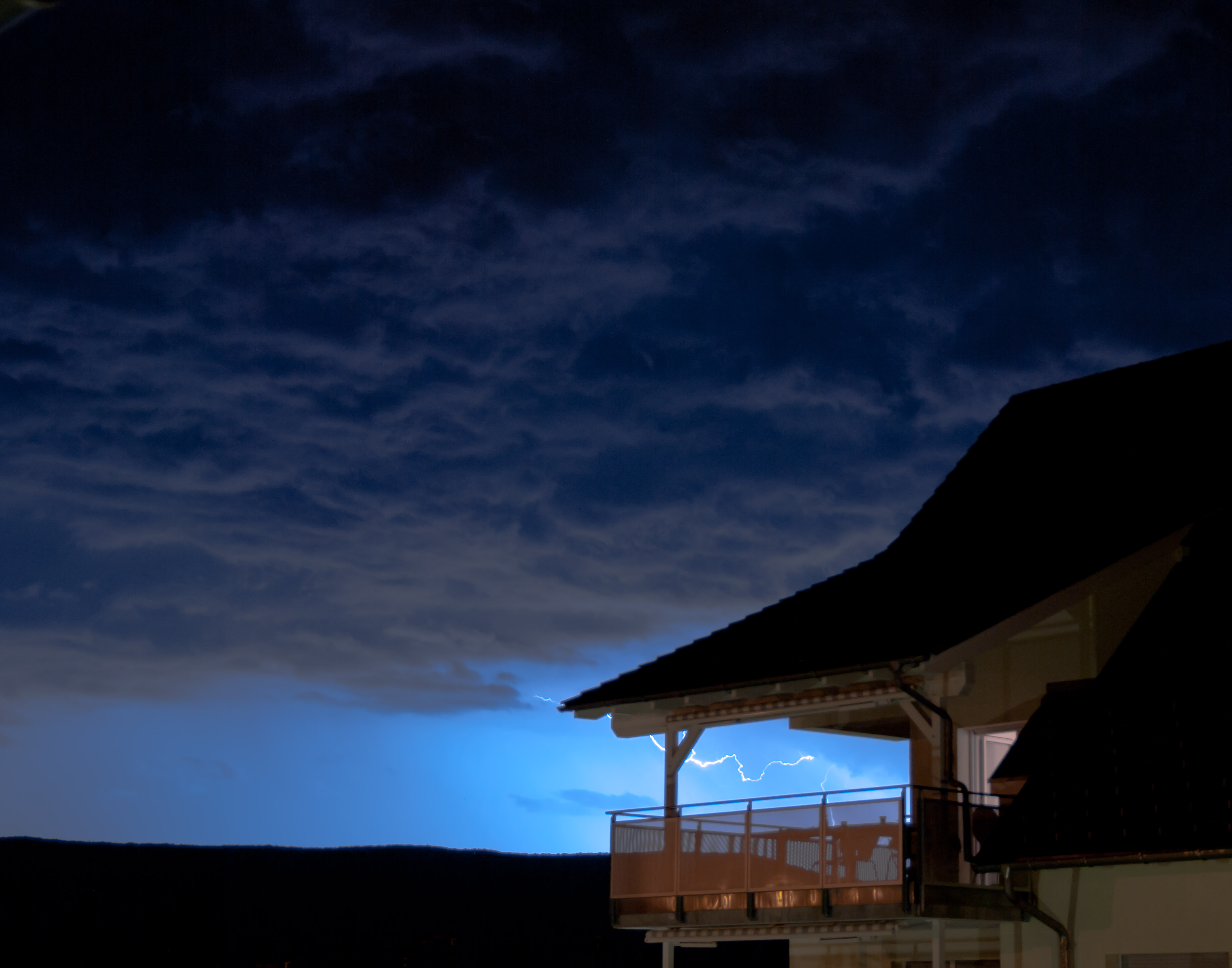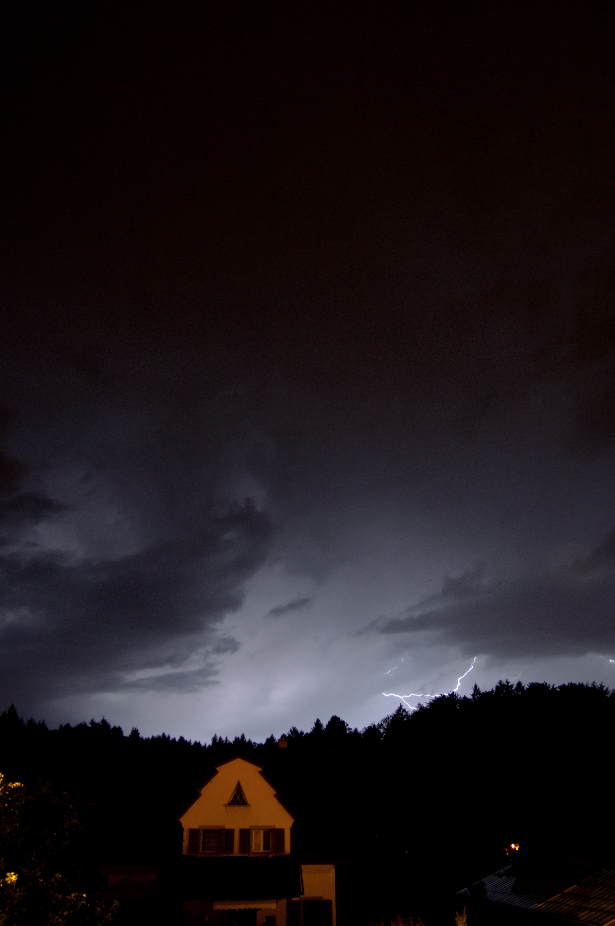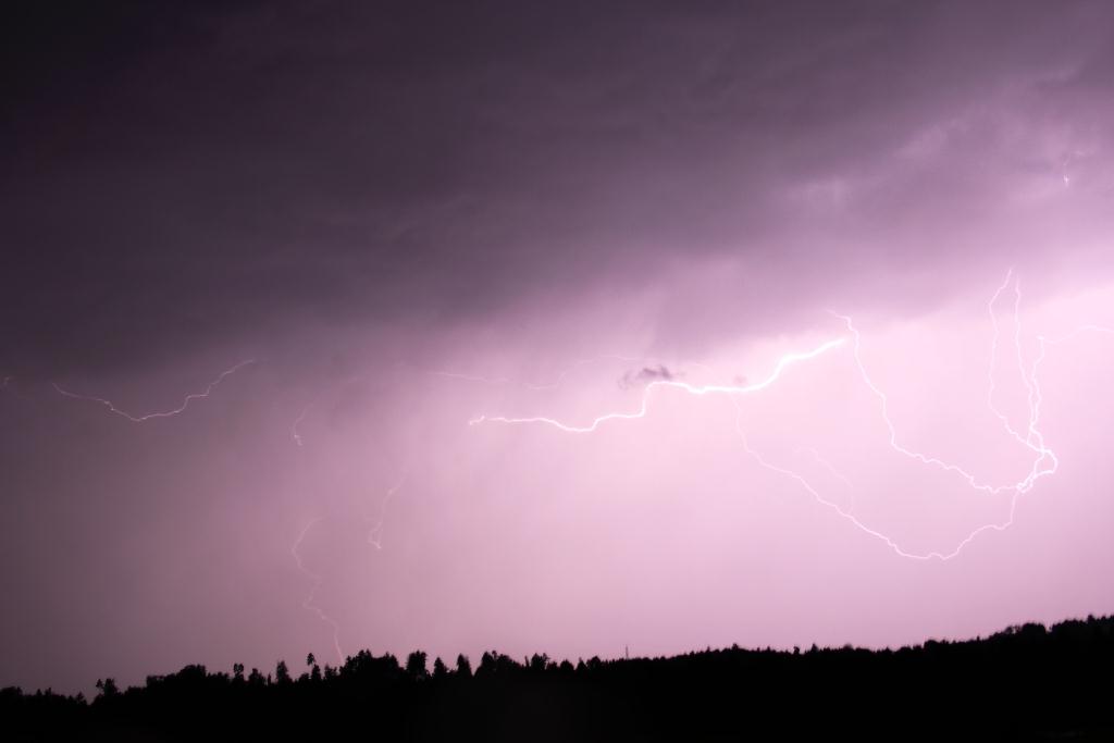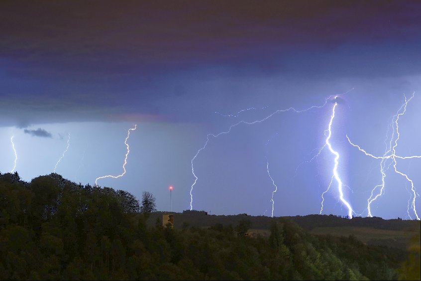 Die gestrige Linie traf uns auch, war intensiv, aber nicht unwetterartig. Bei meinem Wohnort auf einem Hügel in Freiburg (exponiert, 100m über der Stadt) gab es stürmische Böen (schätze mal 60 bis 80 km/h), heftigen Regen und eine beeindruckende Blitzfrequenz. Anfangs gab es recht viele CG's, jedoch in größerer Entfernung. Für passable Bilder hat's dennoch gereicht. Später, bei jedoch zunehmender Blitzfrequenz waren es fast nur noch CCs. Beeindruckend, aber weniger fotogen.