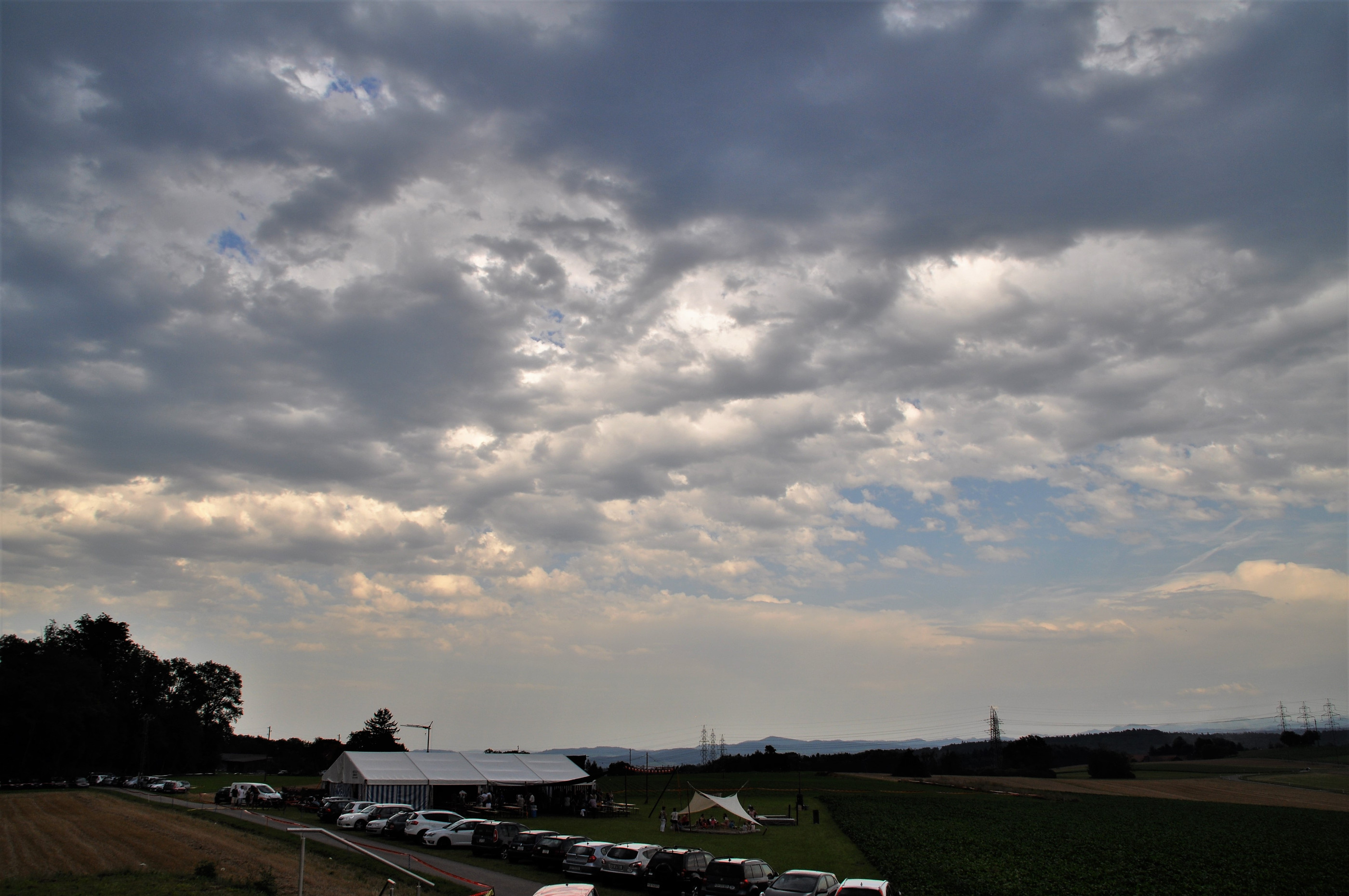 17:11 MESZ. Blick nach Nordosten in Richtung Winterthur. Immer dichter werdende Ac-Felder zeigen das hohe Gewitterrisiko an. Noch sind die Sonnensegel gespannt und die Besucher sitzen noch gemütlich draussen auf den Bänken. Erste Vorbereitungen werden getroffen.