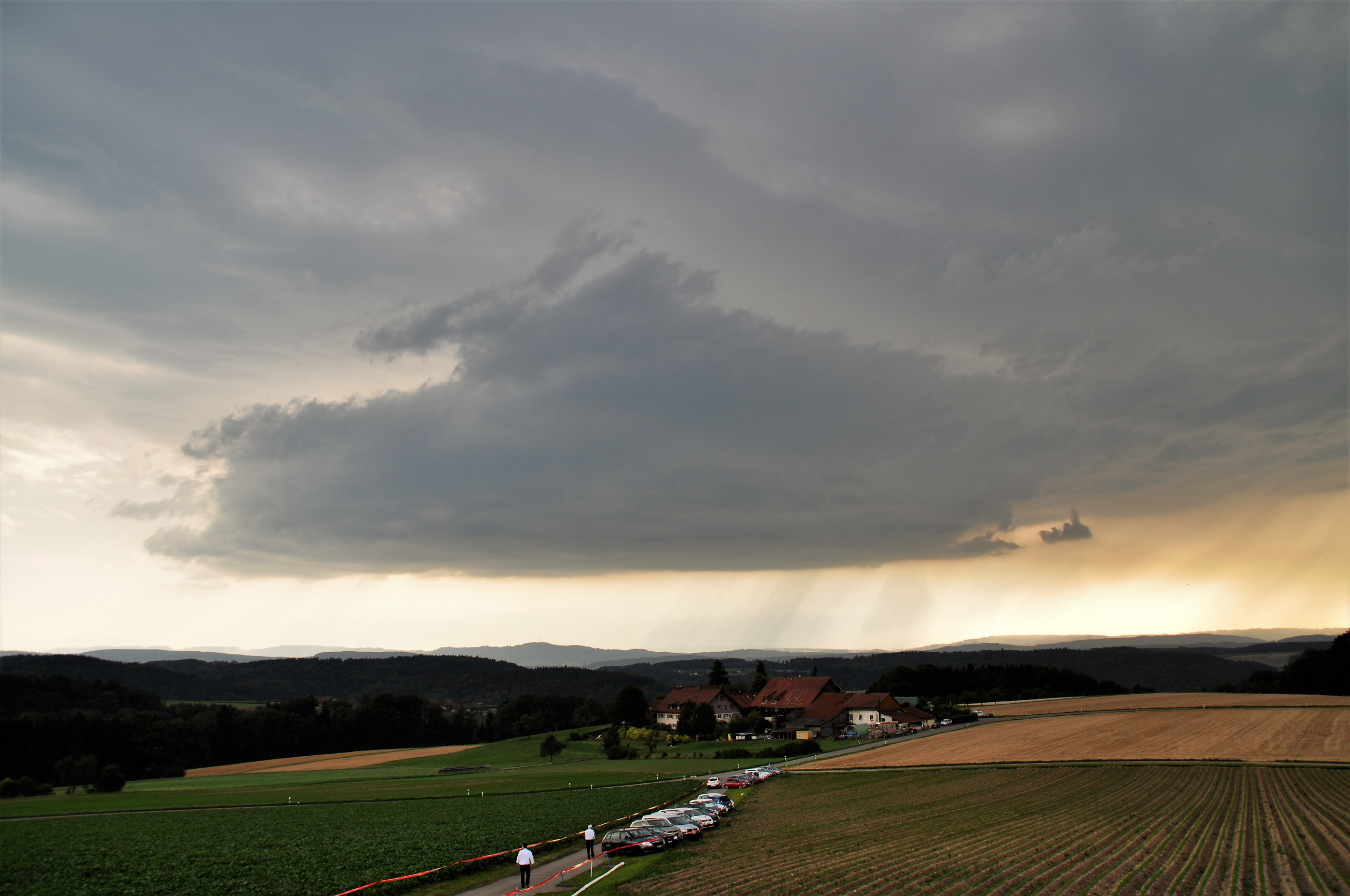 Seit Jahren bin ich öfters auf meinem Hausberg Sonnenbühl (od. Sunnebühl), von dem man bei föhniger Fernsicht sogar 173 km weit bis ins Wallis sehen kann (Bergspitzen von den Les Diablerets). Dann ist auch die Wetterstation auf dem Feldberg (D) fast zum Greifen nah. Ein Spotterplatz, der sich "gewaschen" hat; ideal natürlich auch für eine Gruppe junger Leute, die dort seit Jahren am 1. August ein Fest veranstalten. Nun ging es heuer ins zweite Jahr, dass die Gemeinde Oberembrach mit im Boot ist und so stand auf dem dreitägigen Programm am Nationalfeiertag nicht nur der Jodel- und Gesangsverein auf dem Programm, sondern auch eine Ansprache der Gemeindepräsidentin mit Schwergewicht in ihrer Rede zur geplanten Wiedereröffnung der umstrittenen Strassenverbindung im Eigental. Daniel, ein Landwirt aus der Umgebung und ich kennen uns seit einigen Jahren. Er ist im OK-Team der Festaktivitäten ein wichtiges Mitglied in Bezug auf das Sicherheitsdispositiv. Für mich eine Selbstverständlichkeit, ihm bei Fragen in Bezug auf die Wettersituation zur Verfügung zu stehen; und als häufiger Nutzer des Donnerradars, ist er bestens mt diesem Tool vertraut.