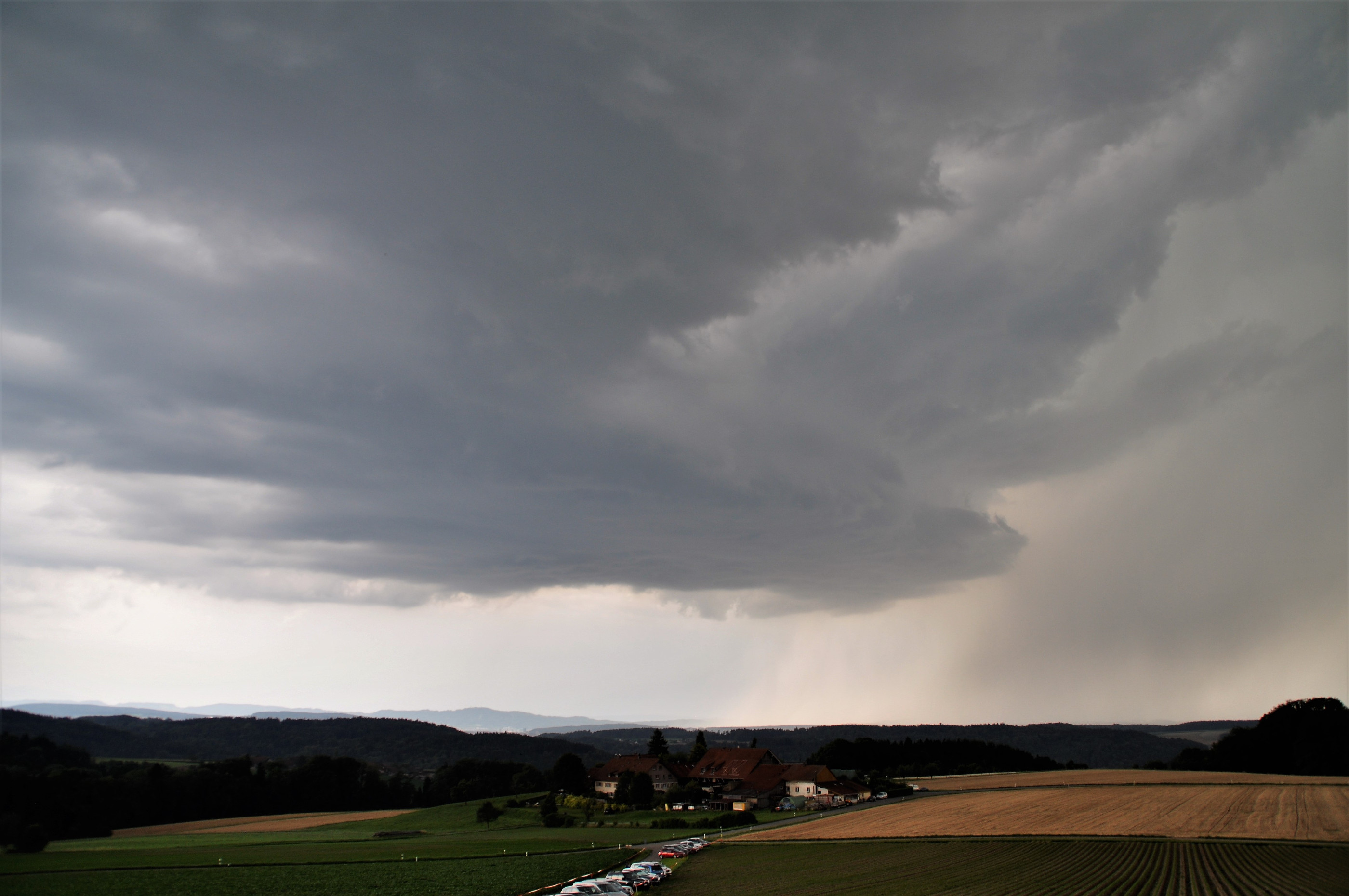 Dann zog gegen 17:45 MESZ ganz knapp der Hauptcore der Superzelle an uns vorbei. Hagelkörner bis ca. 3,5 cm fielen, Sturmböen peitschten die Wassermassen ums Zelt, grelle Blitze zuckten und innerhalb weniger Minuten war der Spuk vorbei. Das nur wenige Kilometer entfernte Brütten hatte es schwer getroffen, wie auch Dättnau und Winterthur-Töss. Die nach rechts ausscherende Superzelle verfehlte uns nur knapp.
