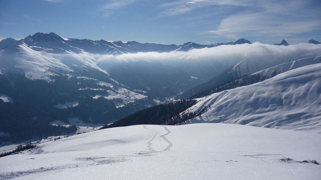 Spannende Wetterverhältnisse heute in den Bergen in der Region Davos; morgens noch Nordwind, dann rasche Abtrocknung und am Mittag plötzlicher Föhneinbruch. Nachfolgend ein Foto von der Inversion auf etwa 2200 m gegen Mittag, während der ruhigen Phase: