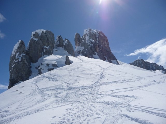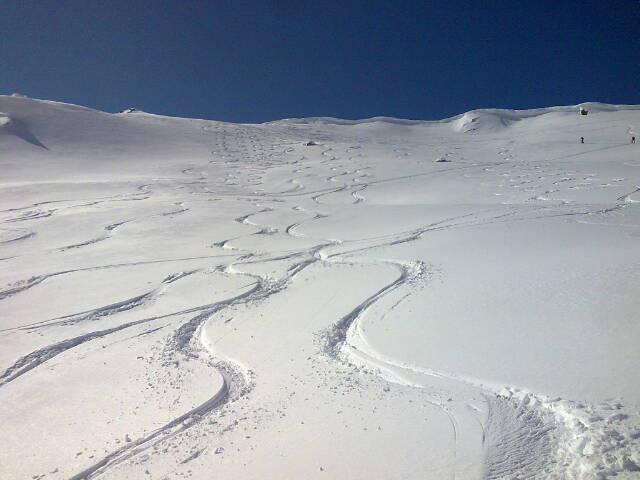 Pulverschnee- und Sulzschneehänge gab es reichlich, und immer noch wenig Spuren. Schnee hat es noch Massen, im Schatten liegen in St. Antönien sicher noch 1.5 Meter, aber hohe Temperaturen, T-Shirt-Wetter auf 2500 m, früh aufstehen lohnt sich!
