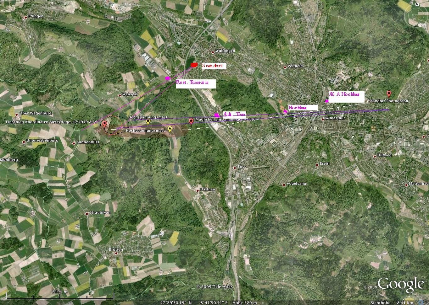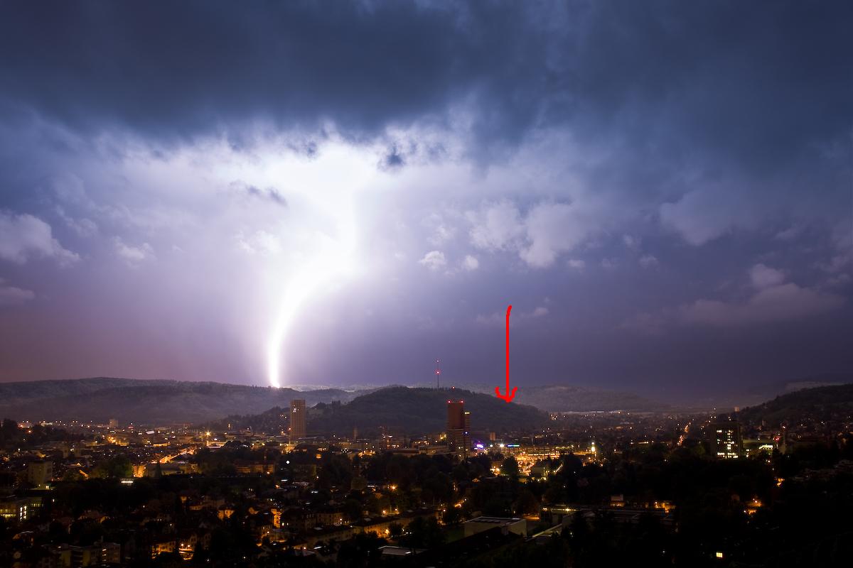Mithilfe der Triangulation könnte der Einschlagsort mit den Messungen bestätigt und eingegrenzt werden. Analysiert man Deine Aufnahme ist der Blitzeinschlag leicht links von der Linie Fotograf (Du)-Sulzerhochhaus-Aldi Töss-Weihertal.... und das AXA-Hochhaus liegt deutlich abgehoben nördlich. Warst Du auf dem Rosenberg?