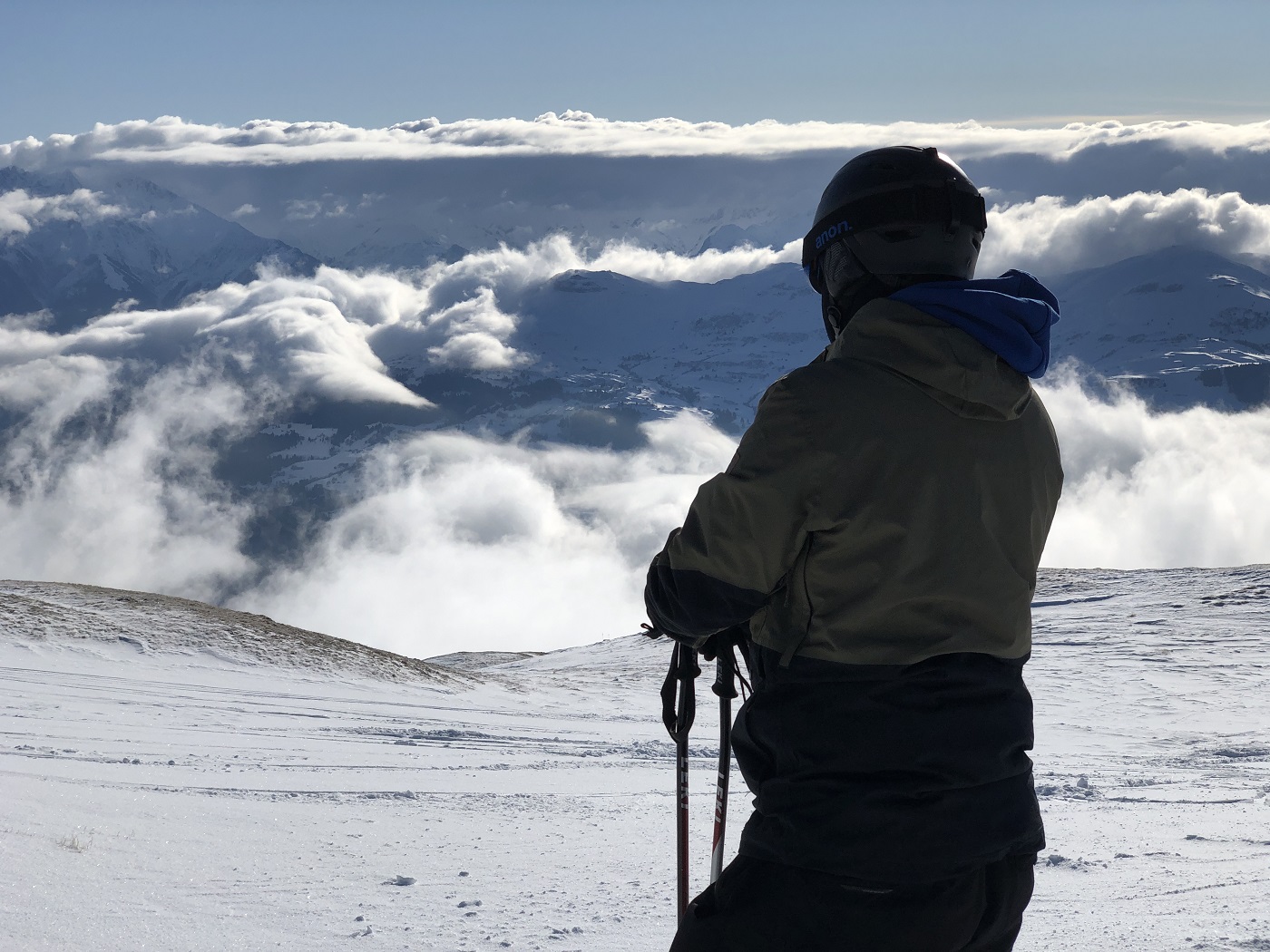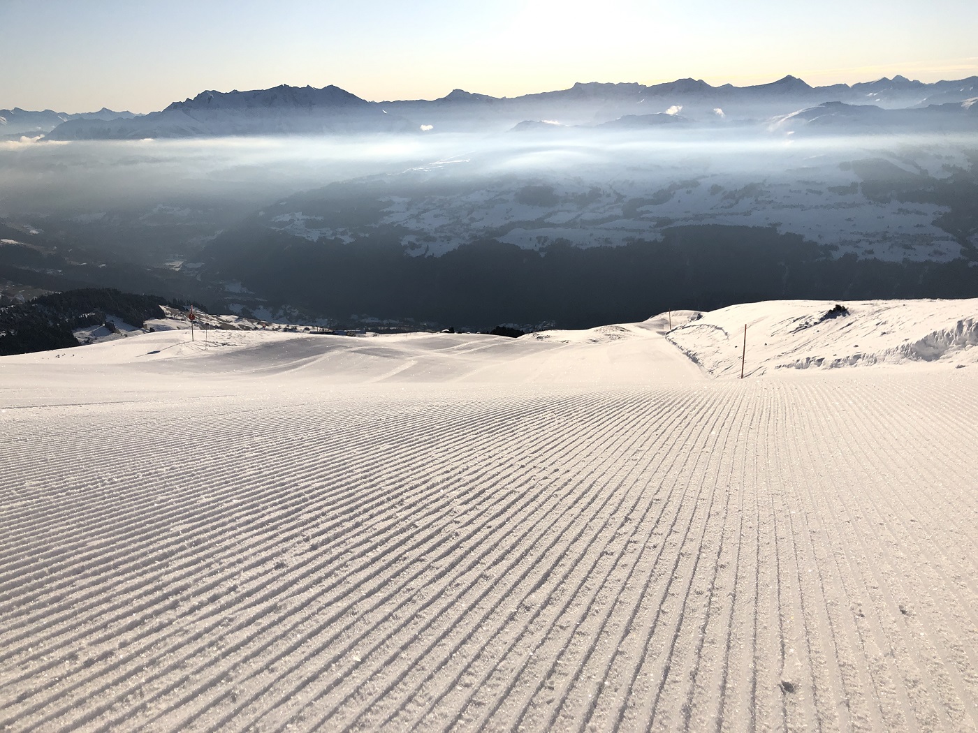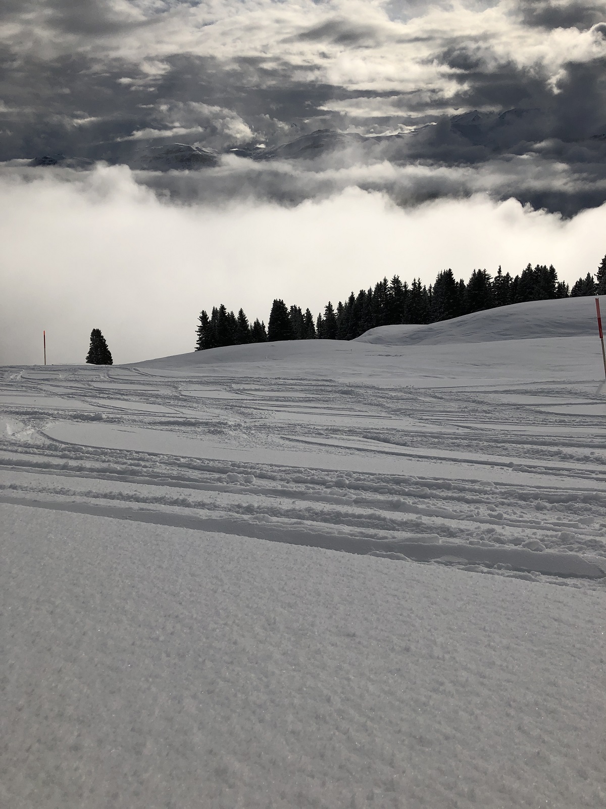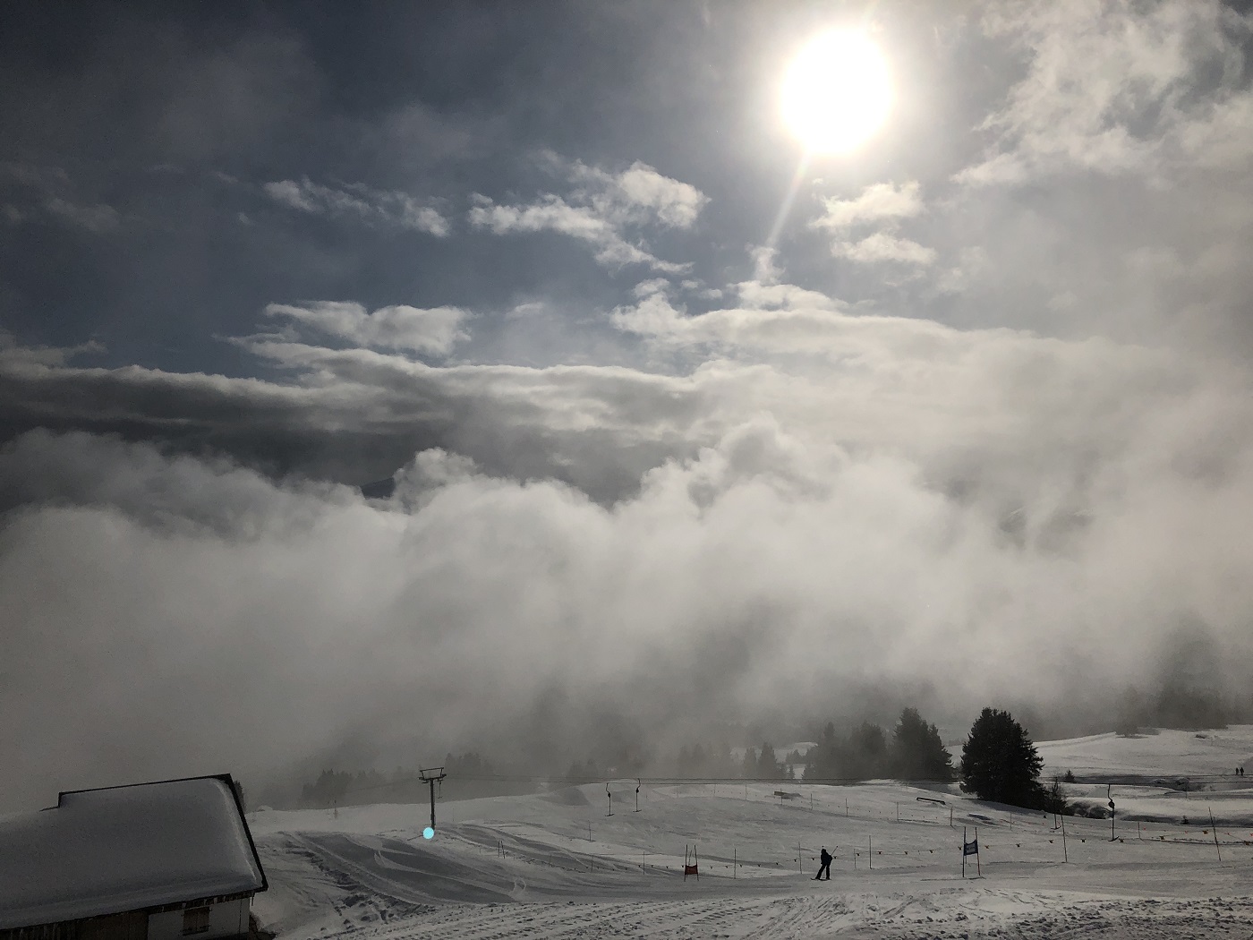 Der Sonntag war dann zu Beginn im Skigebiet völlig klar, wobei rundherum viele Wolken zu sehen waren. Im Verlaufe des Tages zogen dann in gewissen Höhen Wolken auch ins Skigebiet und es gab ein sehr kontrastreiches Panorama.