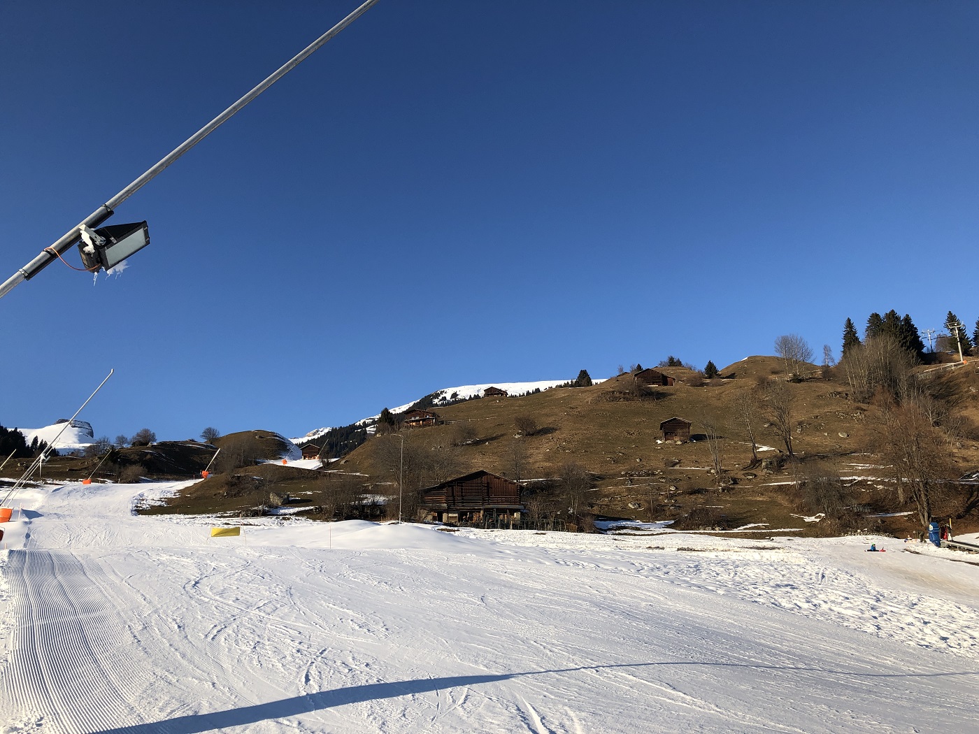 ...und später dann mehrheitlich strahlendes Blau. Und unten auch weiterhin ein markantes Braun am Südhang, durch das sich die die Kunstschnee-Talabfahrt schlängelt.