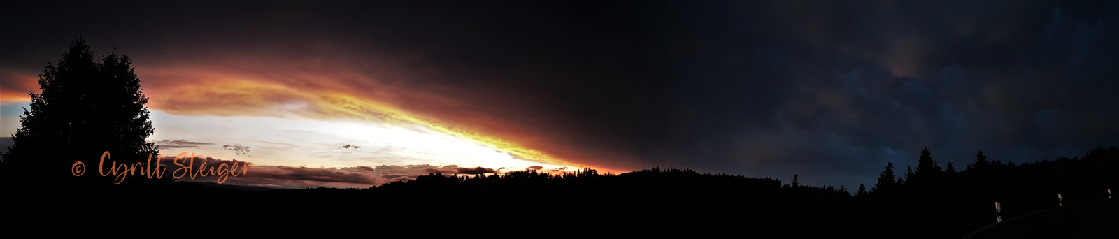 Interessant, wie es hinter der Gewitterlinie / Niederschlagszone (s. Radarloop von Willi) sofort aufklarte und diese wie von einem Käsemesser abgeschnitten wirkte. Vom Sternenberg aus tolle Sicht auf das Wettergeschehen. Blick Richtung Sonnenuntergang; rechts Mammatus = Zelle "futsch"...