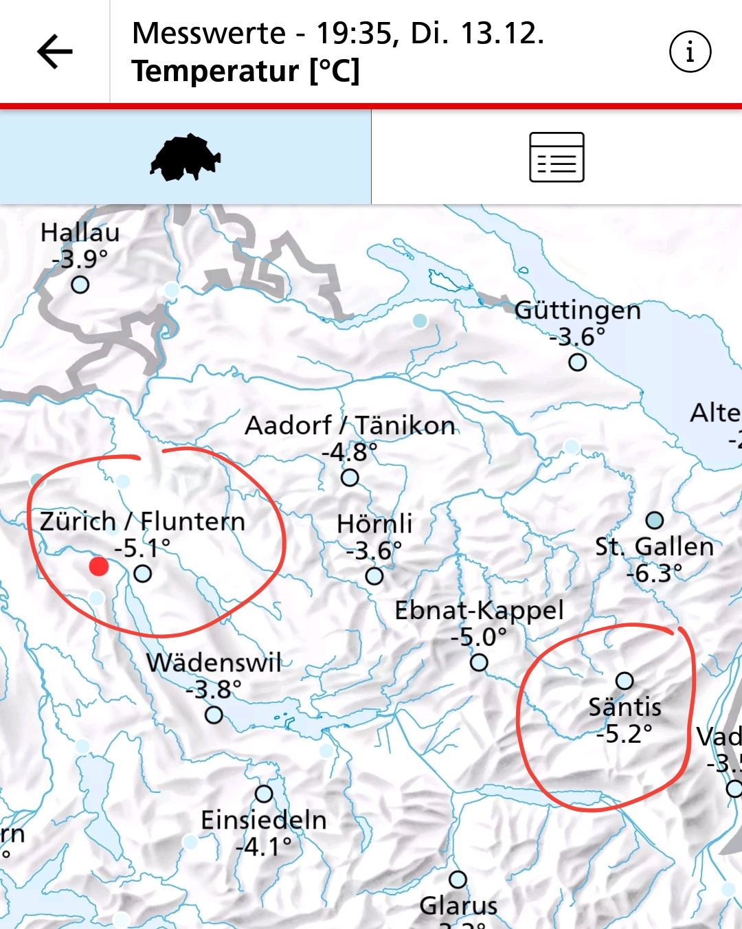 Zürich Fluntern mit - 5.1°C immer noch mitten im KL-See und