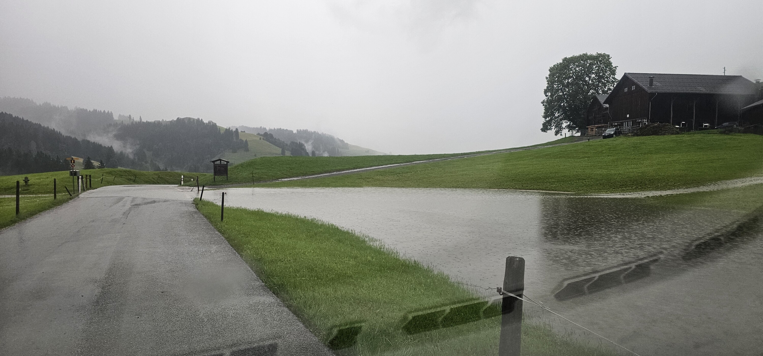 Nach geschätzten 50 mm innert einer Stunde werden die Wiesen überall zu Bächen