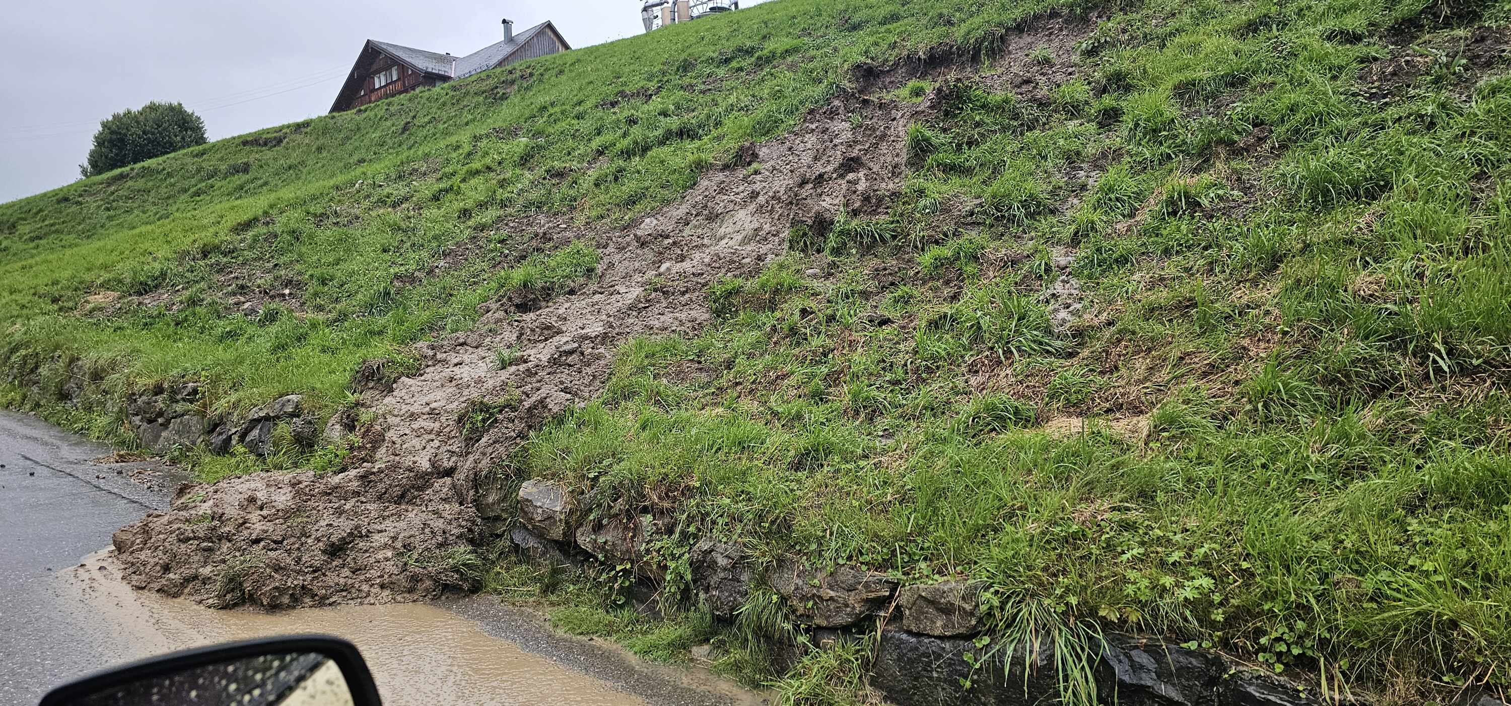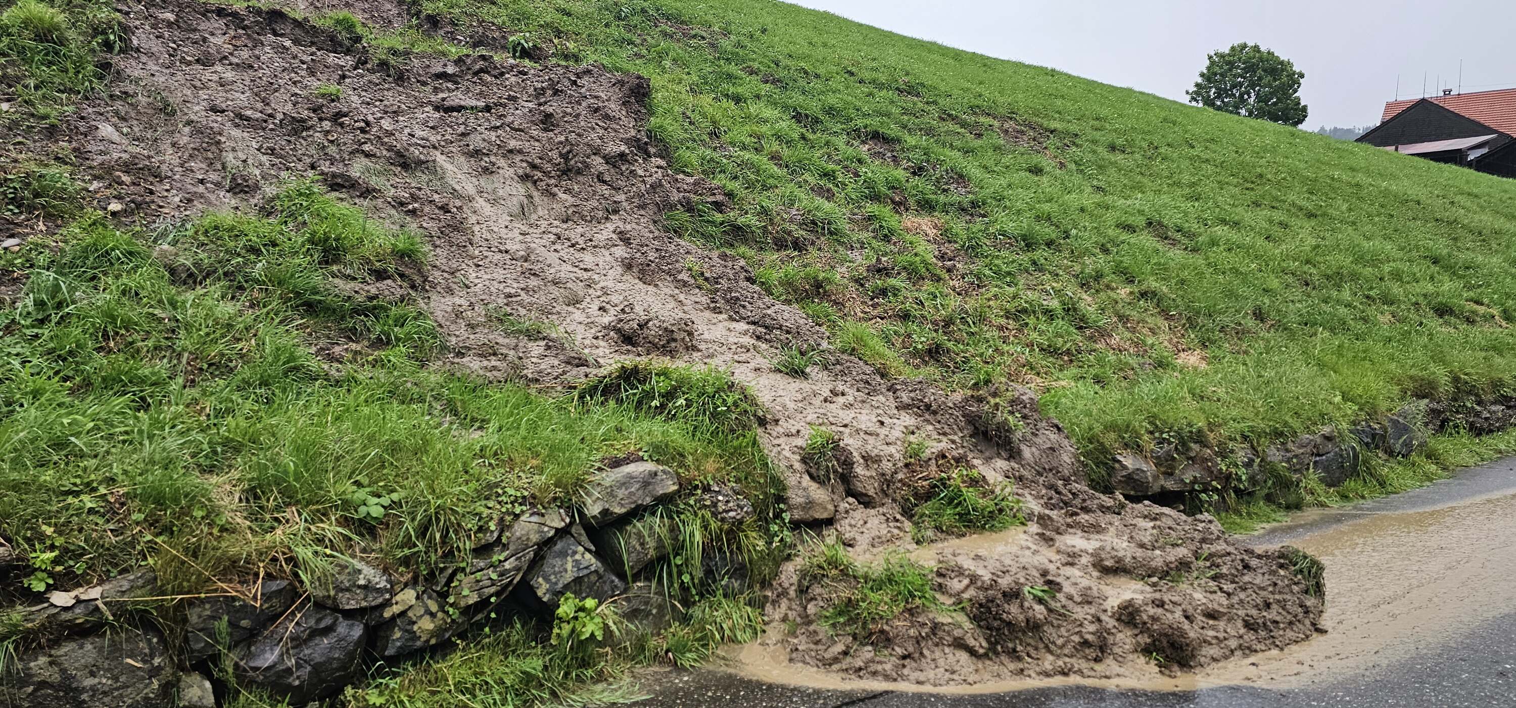 Nach zwei Stunden lässt es etwas nach, die Böschung entlang der Strasse signalisiert, dass es auch langsam Zeit wurde. Ich würde die 2h-Menge hier in der Gegend auf etwa 70 bis 80 mm schätzen: