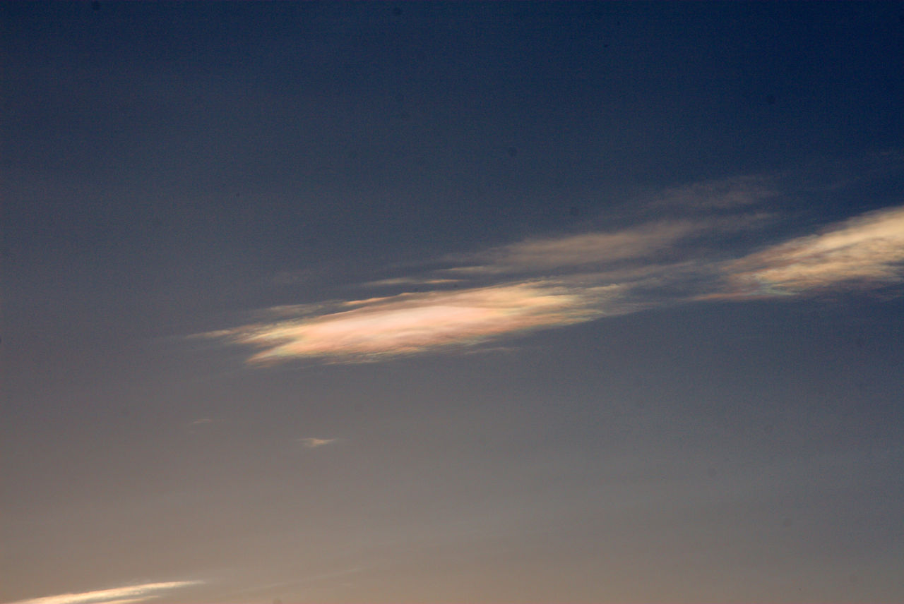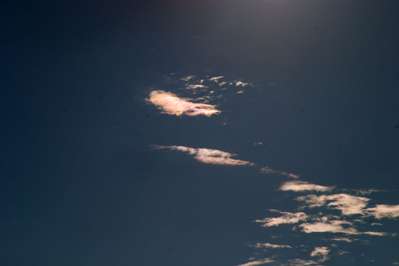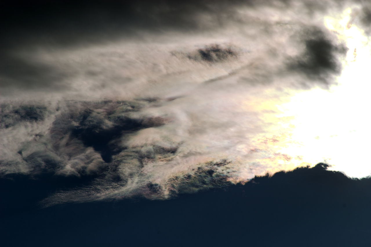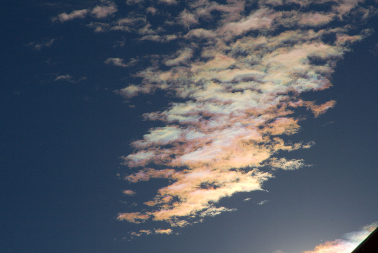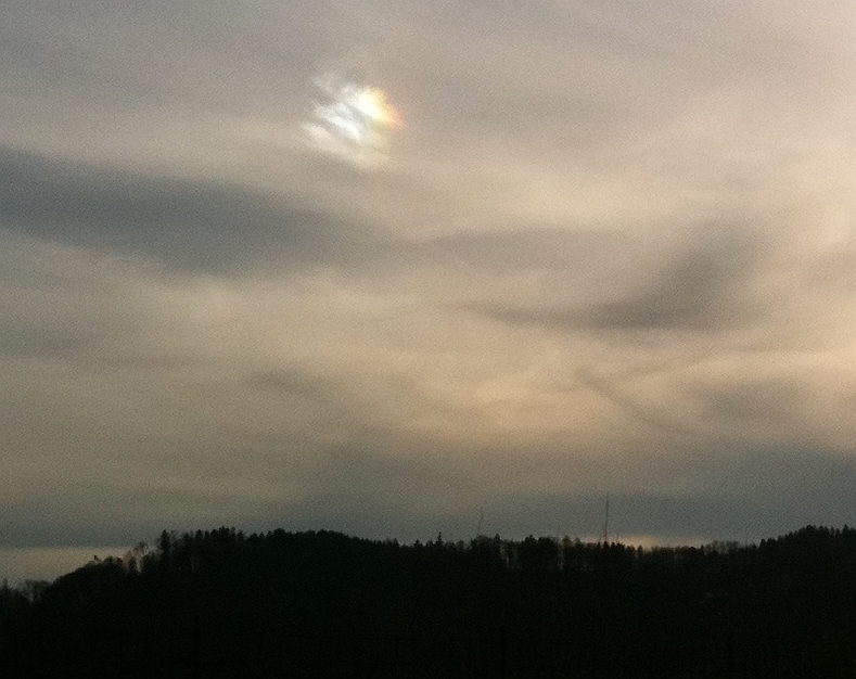 Gesten Abend (16.30 Uhr) durfte ich in Lenzburg, wieder einmal eine irisierende Wolke beobachten. Auf dem Bild (Handy-Pic aus fahrendem Auto, sorry für die schlechte Qualität) sieht es wie ein Loch in der grauen hohen Wolkenschicht aus. Es war aber eine tiefer liegende feine Wolke, die perlmutartig geleuchtet hat.