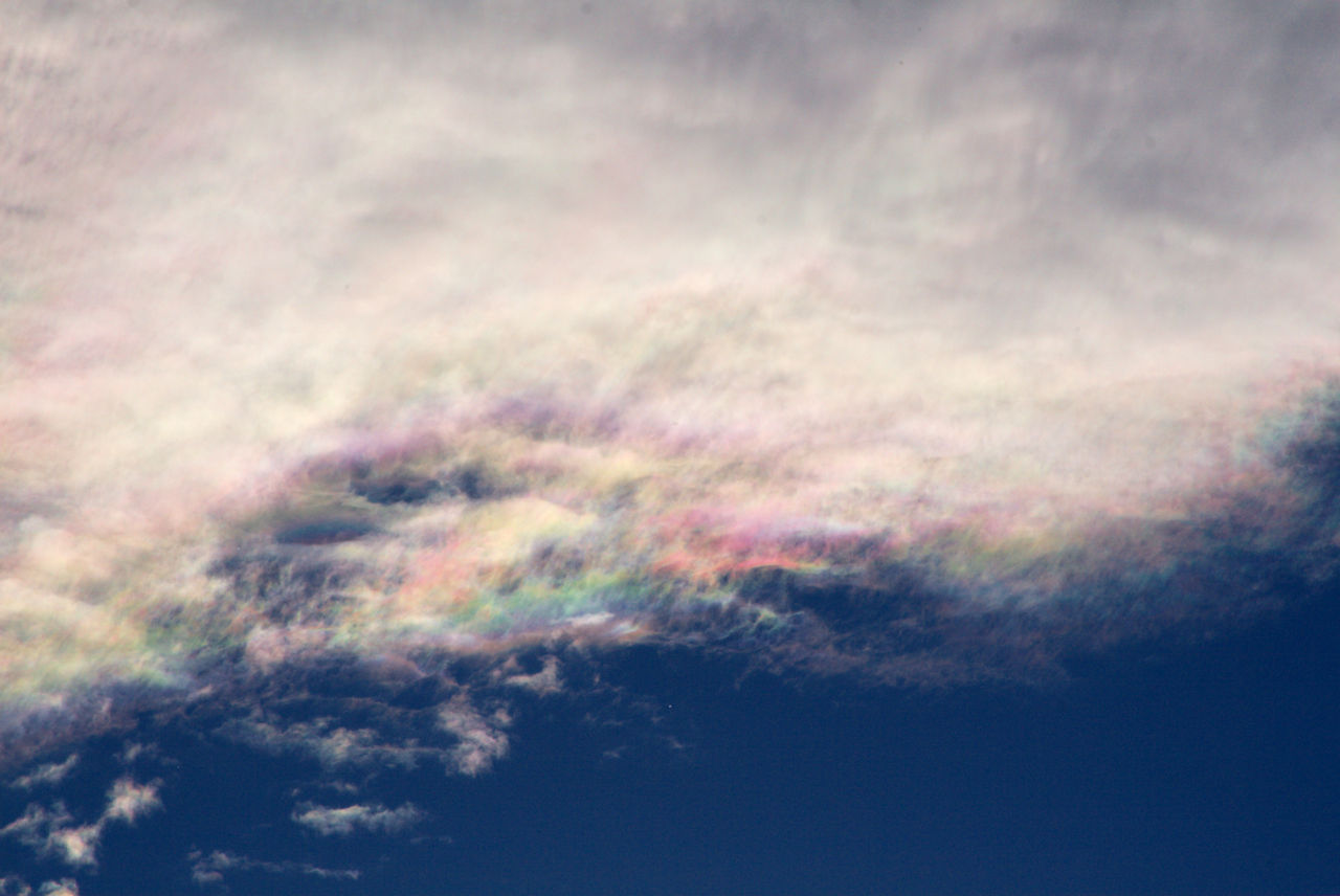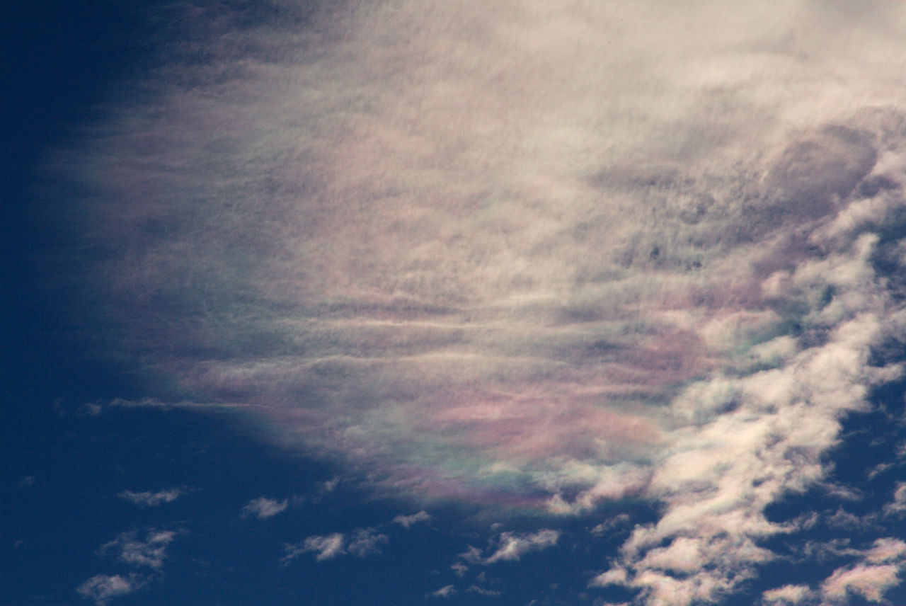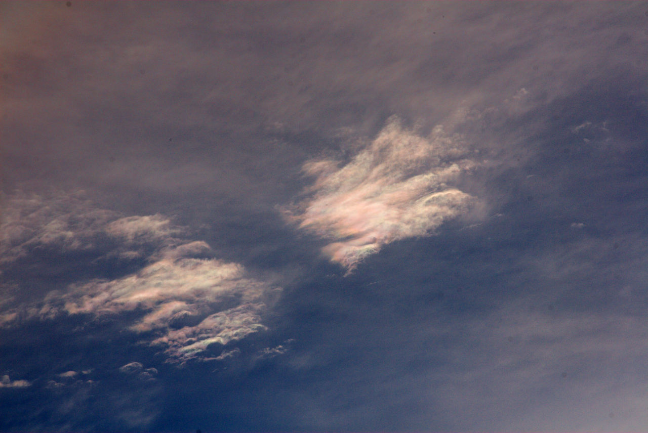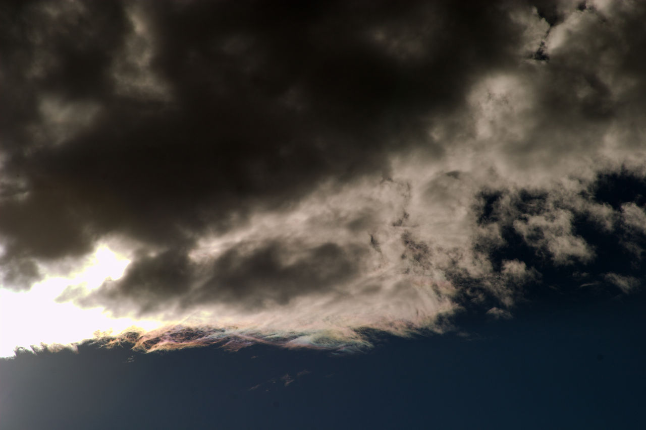 Gesten Abend (16.30 Uhr) durfte ich in Lenzburg, wieder einmal eine irisierende Wolke beobachten. Auf dem Bild (Handy-Pic aus fahrendem Auto, sorry für die schlechte Qualität) sieht es wie ein Loch in der grauen hohen Wolkenschicht aus. Es war aber eine tiefer liegende feine Wolke, die perlmutartig geleuchtet hat.