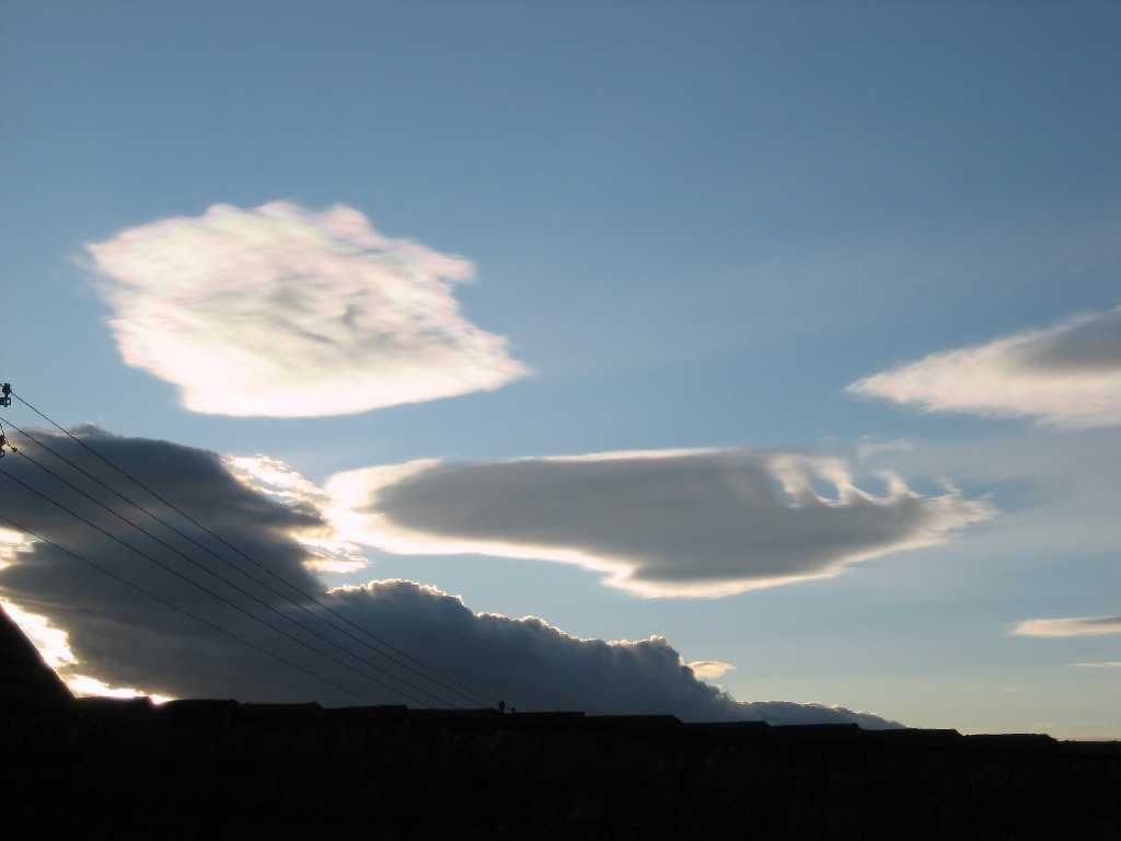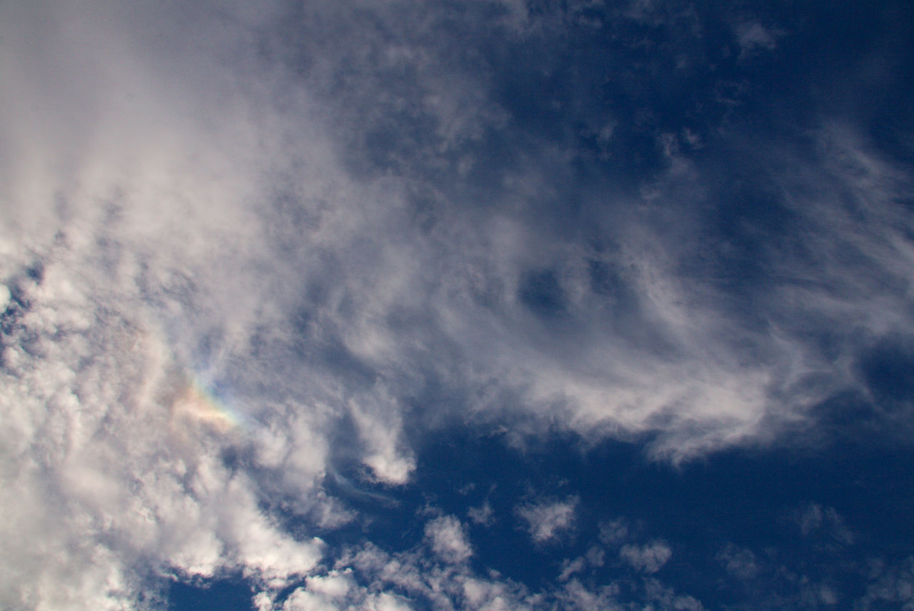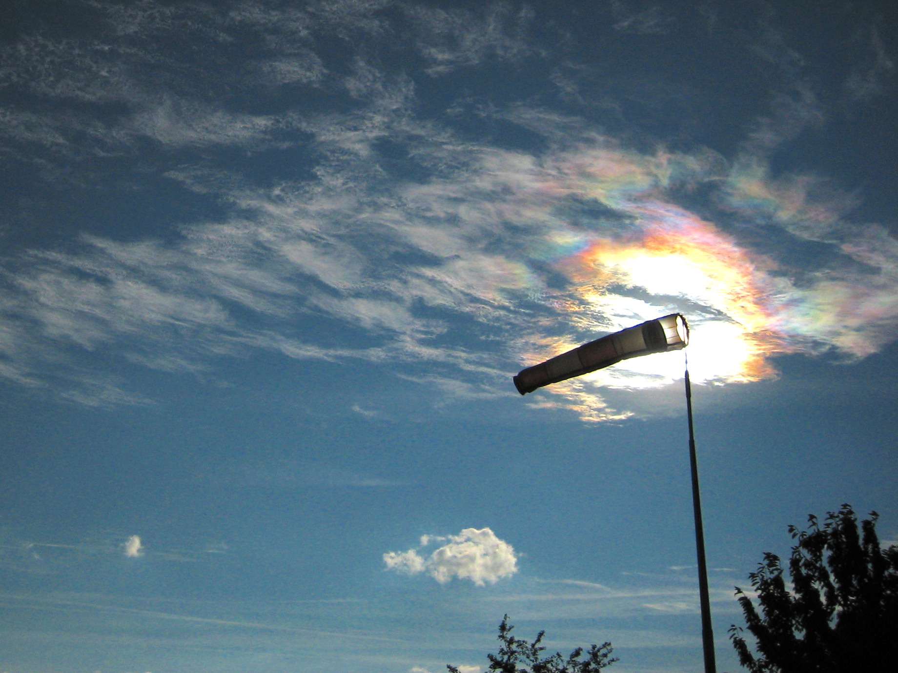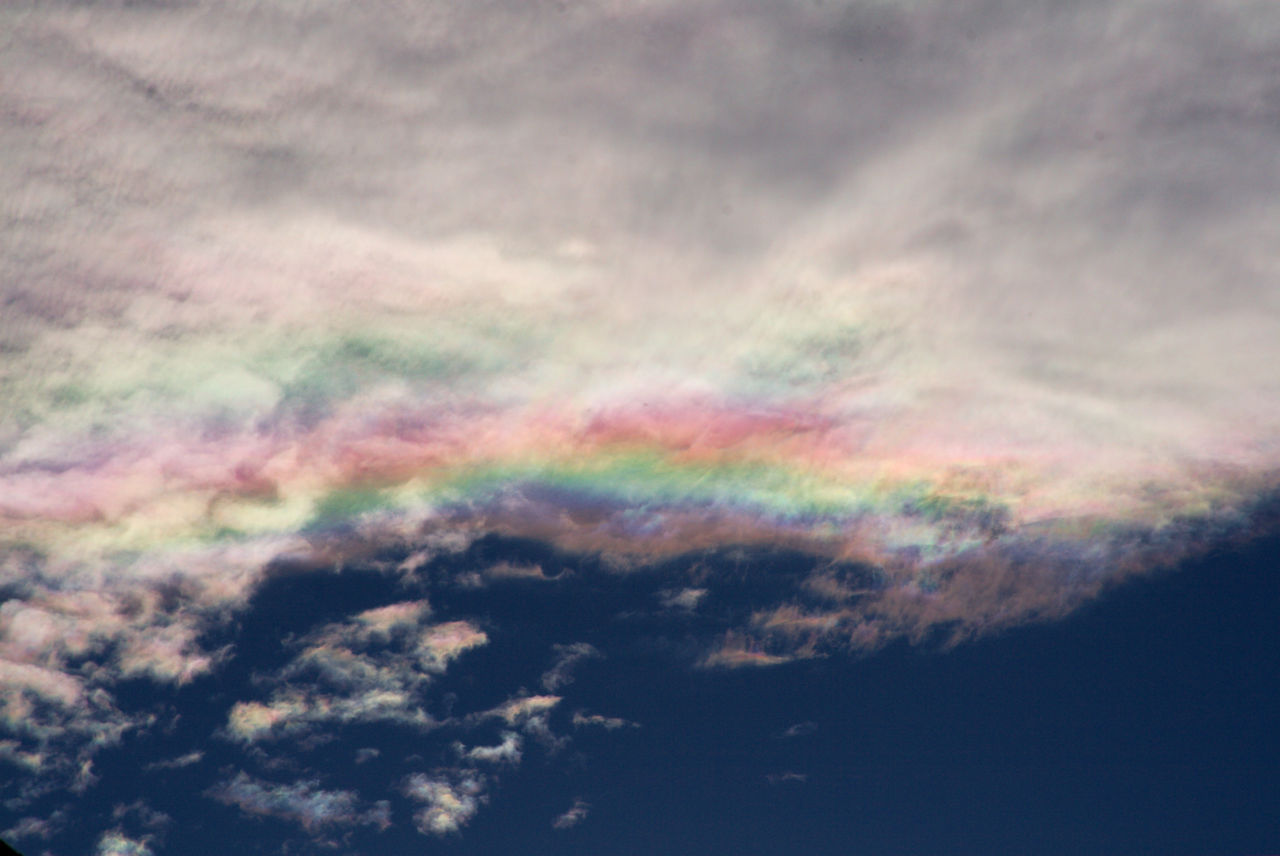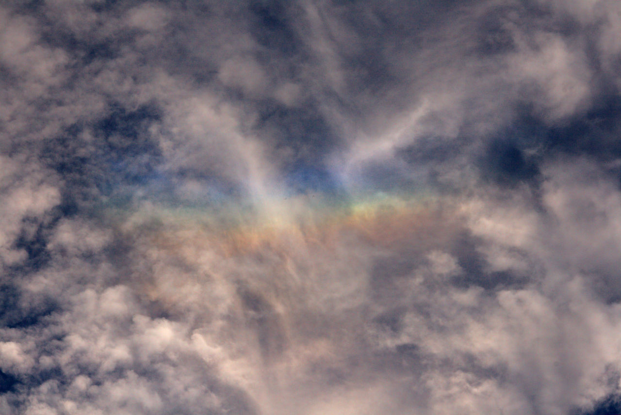 Gesten Abend (16.30 Uhr) durfte ich in Lenzburg, wieder einmal eine irisierende Wolke beobachten. Auf dem Bild (Handy-Pic aus fahrendem Auto, sorry für die schlechte Qualität) sieht es wie ein Loch in der grauen hohen Wolkenschicht aus. Es war aber eine tiefer liegende feine Wolke, die perlmutartig geleuchtet hat.