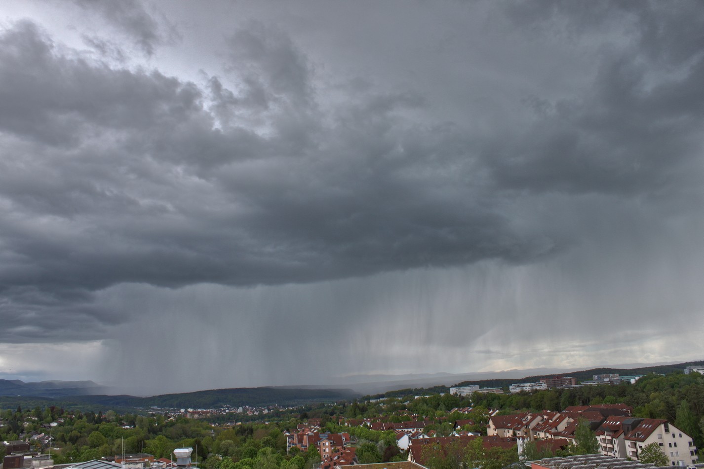 Der Kegelverein war hier in Konstanz auch zu besuch und hat eine imposante Böenfront zur Begrüßung erst mal mitgebracht. Auch Hagel bis 5mm und Paar ordentliche Kracher. Das hat für das Chasing von gestern Abend voll entschädigt :up: Kurzlebige funnelähnliche Absenkung war auch sichtbar, jedoch war Rotation nicht erkennbar, ev also auch ein "glatter" Fractus.