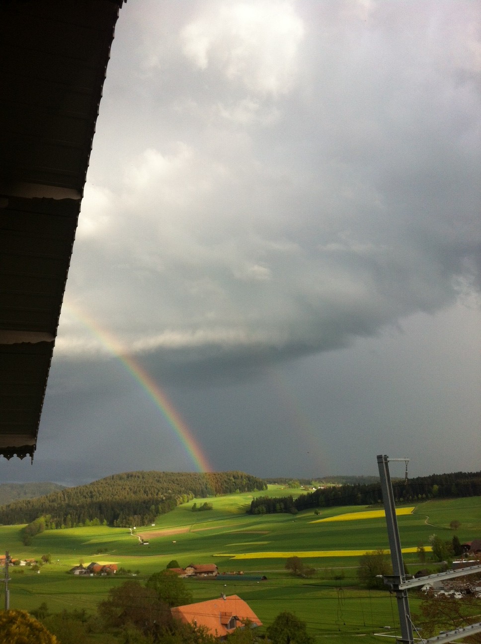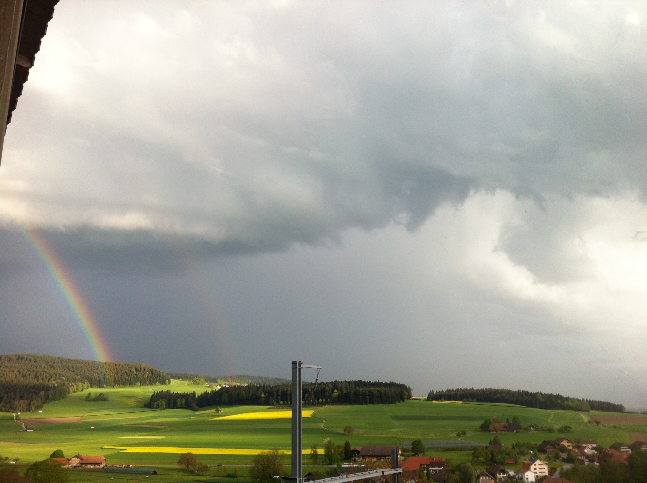 Ich habe auch noch ein paar schöne Bilder von gestern Abend. Julian und ich waren gerade draussen auf der Terrasse am Abendessen, als eine sehr fotogene Zelle über Thun zog. Ich zückte mein iPhone und machte ein paar Bilder. Für Blitzfotos hat's leider nicht gereicht... dafür für einen wunderschönen Regenbogen!
