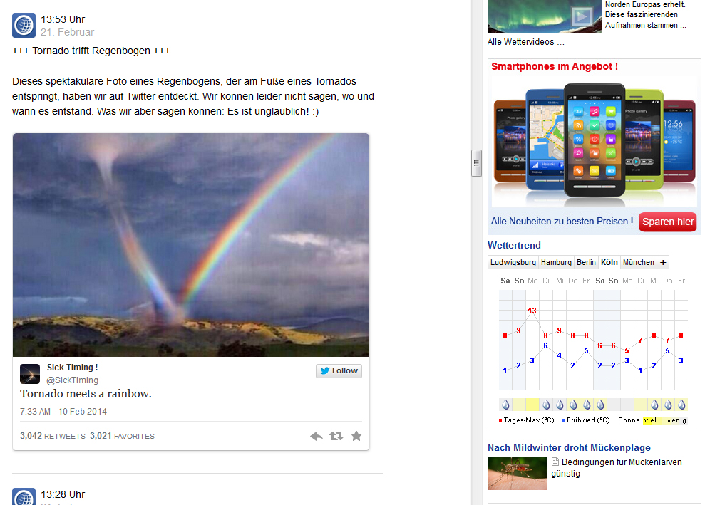 Natürlich geht es um Klickzahlen, das ist doch kein Geheimnis. Klicks bedeuten Umsatz und der wiederum sicher die Arbeitsplätze von 60 Mitarbeitern. Unsere Wetterredaktion besteht ausschließlich aus meteorologischen Fachleuten und allein daran kannst du erkennen, dass der Qualitätsanspruch hoch ist. Aber: Wir müssen unsere Produkte auch verkaufen. Es bringt uns nichts, das fachlich beste Produkt zu haben, wenn es niemand nutzen möchte. Also versuchen wir, fachlich korrekt, aber gleichzeitig massenwirksam zu berichten. Dabei schlägt das Pendel mitunter mal mehr in Richtung Korrektheit und mal mehr in Richtung Massentauglichkeit aus, beides spielt aber immer eine Rolle. (Quelle: http://www.wzforum.de/forum2/read.php?3 ... sg-2857694)
