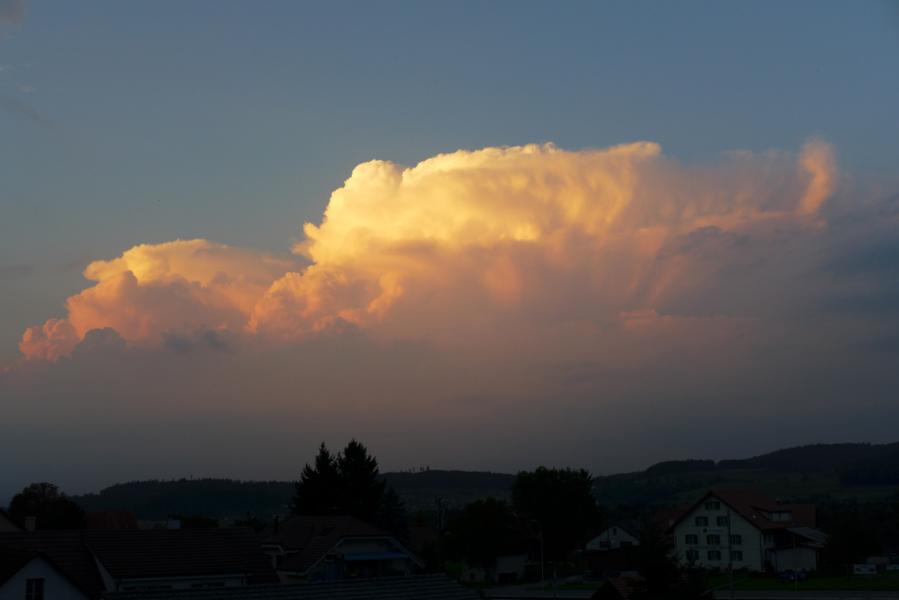 Die zahlreichen Zellen in dieser Region brachten zwar 2 oder 3 Naheinschläge und Windböen, dafür kaum Regen in Oberi. Ich war in leicht regnerischem Reutlingen nicht weit von hier, und sah, dass etwas gleich los gehen südöstlich von mir würde. Aber wegen Blitzgefahr musste ich mit dem Velo da bleiben wo ich war. Ich wollte nicht meine Frau eine Witwe machen!
