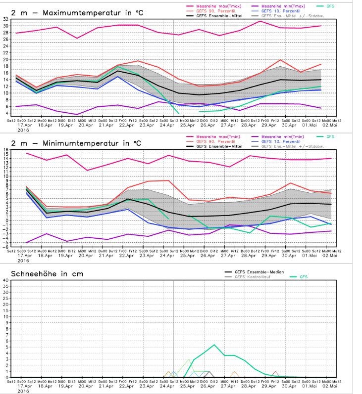 Wegen der fehlenden Achsenbeschriftung: Durch einen Quervergleich mit den frei erhältlichen GFS-Ensembles kann die Achsenbeschriftung händisch ergänzt werden. Der Temperatur-Peak ist in der Nacht auf den 21.03.2016 zu erwarten.