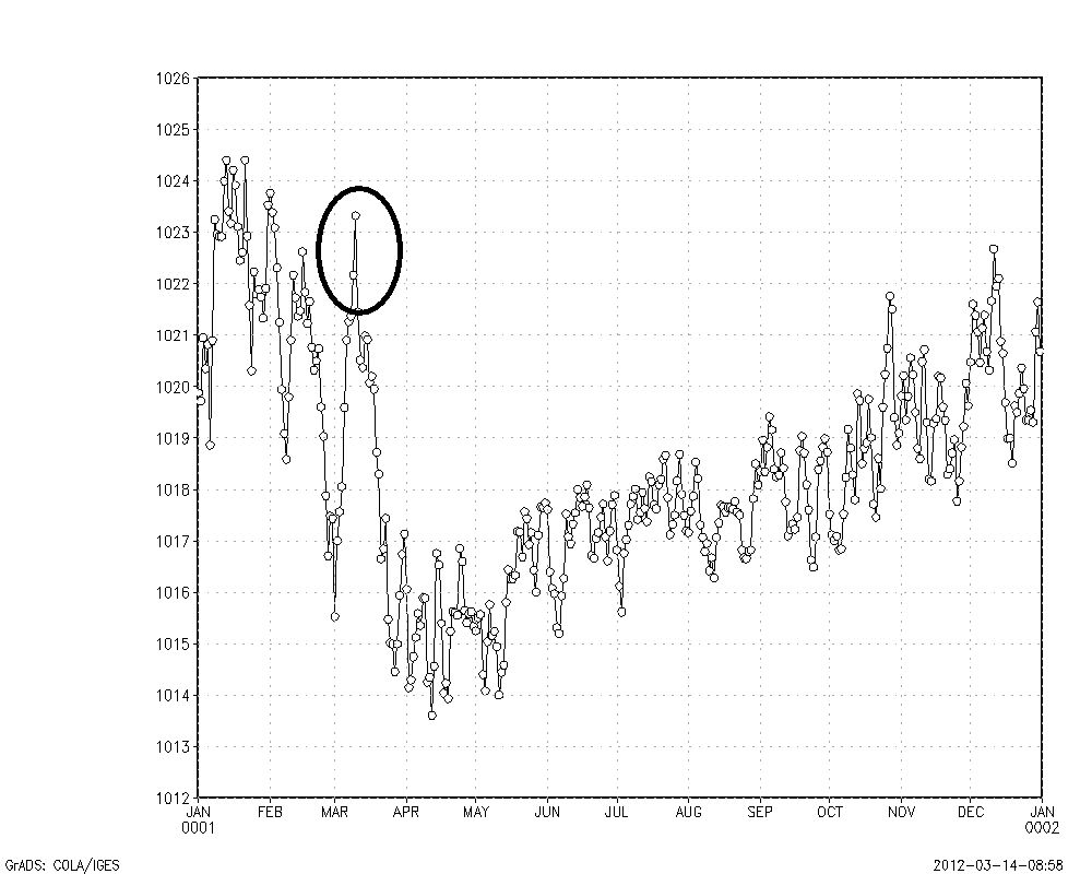 Und ab den 10.3. deutet sich auch Hochdrucklage an ... passiert oft um diese Jahreszeit ... unbekannte Singularität mit sek. Maximum der rel. Sonnenscheindauer in den Bergen (nach "Altweibersommer") ... aber auch an Reanalysis-Daten (mittl. tgl. Luftdruck Alpenraum) erkennbar:
