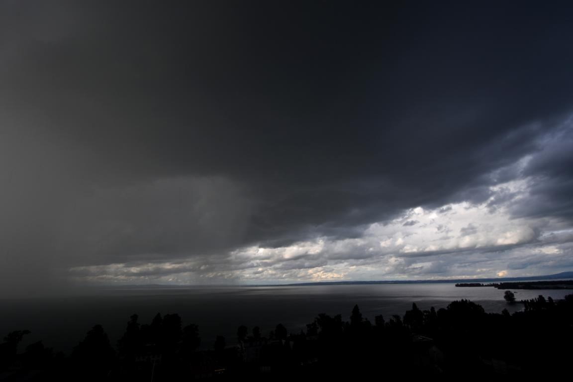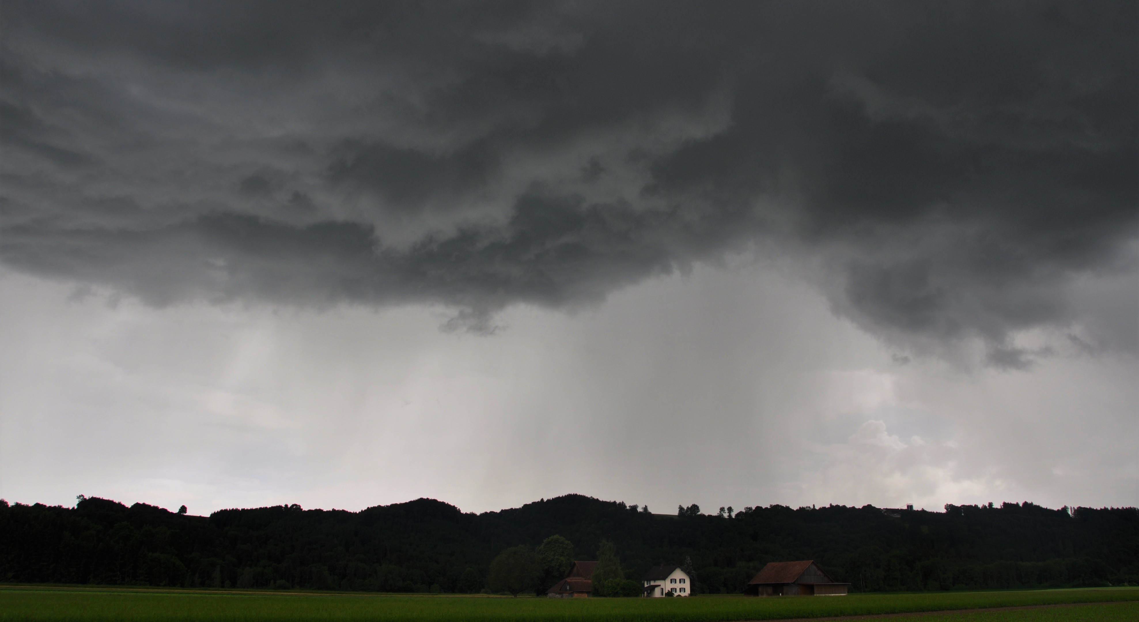 Gestern entwickelte sich nur wenige Kilometer entfernt von Mörschwil eine Gewitterzelle mit Intensität über 60 mm/h. Ich wollte gerade weg und habe deswegen einen Blick auf das Radarbild geworfen, sonst hätte ich nichts davon mitbekommen. Ich ging auf den Balkon und sah die Regenwand im Westen. Da fielen mir plötzlich im Nordwesten Wolken auf, die etwas tiefer lagen als die sonstige Wolkenbasis. Beim genaueren Hinschauen erkannte ich Rotation in dieser wenn auch nur minimalen Absenkung. Ich zückte mein Handy und wollte filmen und dann "Akku fast leer". Da braucht man einmal die Handykamera für etwas wirklich wichtiges und dann geht das Teil nicht. Sowas von ärgerlich!!