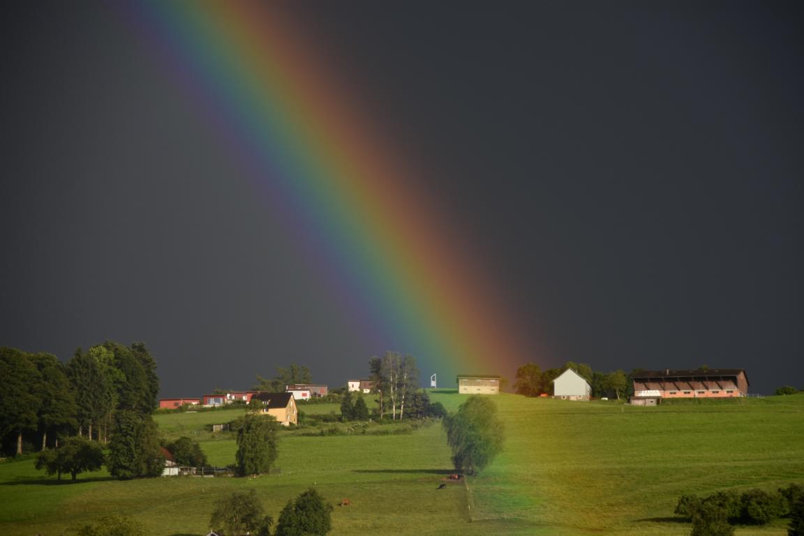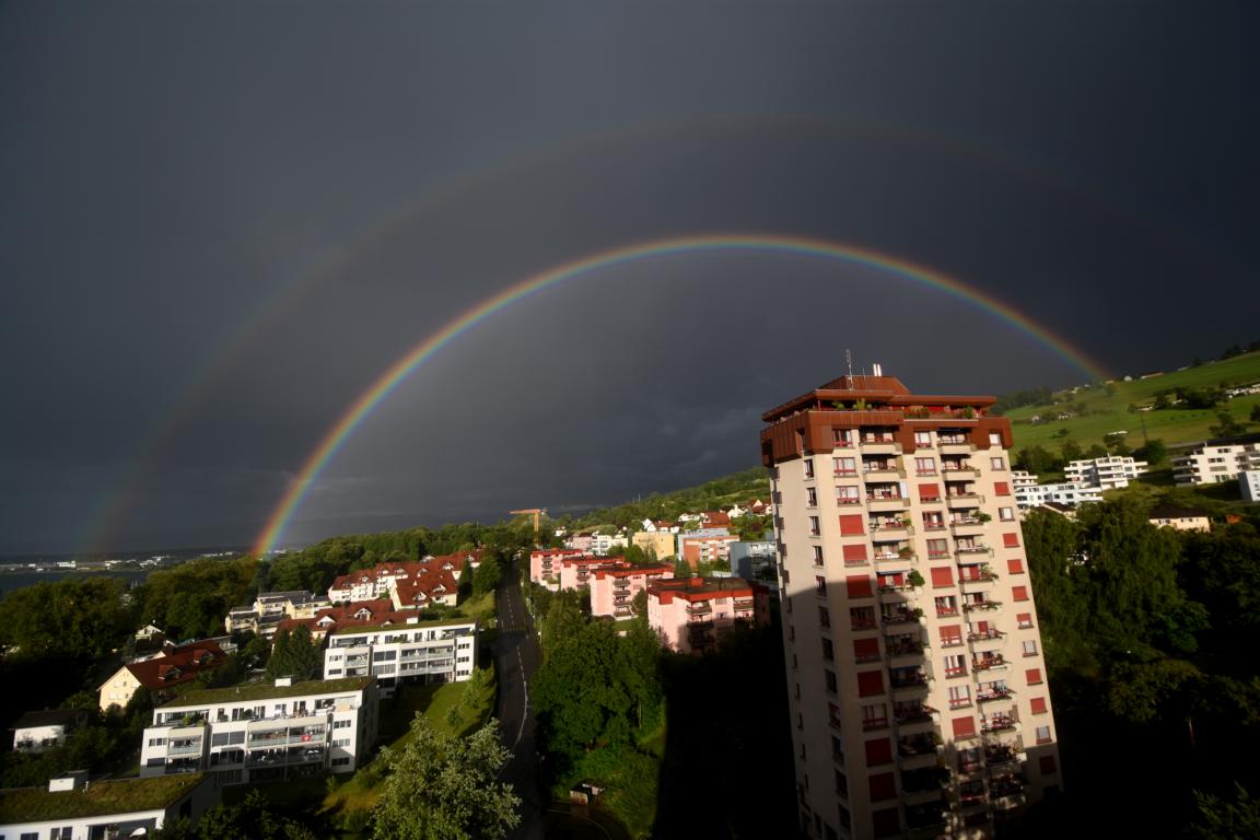 Das Regengebiet streifte mich mehr, sodass nur 2.9 mm/10 min zu verzeichnen waren. Dafür konnte ich auf dem Weg nach Goldach einen wunderschönen doppelten Regenbogen sehen. Selten kam mir ein derart schönes Exemplar vor die Augen. Aber natürlich: Wegen weiterhin fehlendem Akku streikte die Handykamera. Musste wohl so sein. Das beste kommt immer, wenn die Technik nicht mitmacht. Umso erfreulicher ist es, dass Dr. Funnel diesen Regenbogen fotografiert hat.